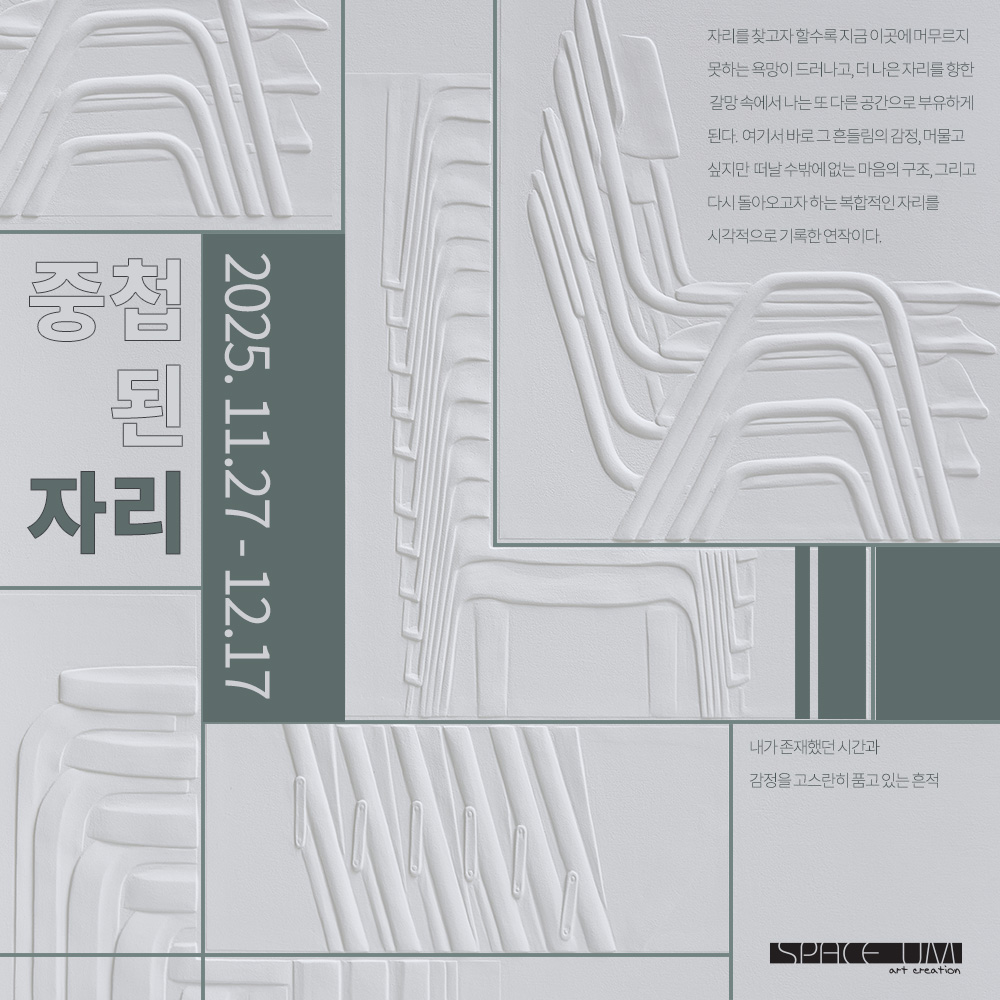 <중첩된 자리>의 의미 해석 전시서문 | 엄윤선 (스페이스 엄 대표) 김지연 작가가 ‘자리’라는 주제로 한 작업들이 내세운 주인공은 의자입니다. 모든 화면에 다양한 스타일의 의자가 등장합니다. 의자는 사람의 관점에서 ‘자리’를 설명하기에 더할 나위 없이 적합한데 특히 ‘신분’을 정의하는 메타포로서 역할이 큽니다. 왕위와 권력을 상징하는 ‘왕좌’가 좋은 예이지요. 사람의 성장과 변화에 따라 자리와 의자의 모양은 함께 변합니다. 학생시절엔 딱딱한 나무의자였고 사회에 나와선 기능형 사무의자에 앉게 됩니다. 승진을 해서 신분이 높아지거나 경제적으로 여유가 생기면 의자는 커지고 푹신해지며 디자인도 예술적으로 발전합니다. 그 반대의 경우도 있고요. 사실 이 해석들은 의자의 클리셰입니다. 작가는 이 전형적인 클리셰의 범위를 넘어 단순히 의자의 형태만이 아닌, 의자와 그것이 위치한 공간과의 연계를 통해 사람의 자리에 대한 해석을 시도합니다. 얇은 부조, 화면을 장악한 흰색. 빛을 튕겨내고 나타나는 옅은 그림자만이 화면의 윤곽을 뚜렷하게 하는 작가의 표현법은 관객의 직관적 해석에 난이도를 던집니다. 의자의 다양한 종류, 배치, 적재의 형태는 인간의 일상과 인생의 다양함을 보여주지만 이 모든 표현이 쉽게 드러나지 않고 전적으로 빛에 의존해, 그림자의 존재 여부에 따라 선명하게 보이기도, 혹은 백색의 평면으로만 보이기도 한다는 점은 작가의 의도가 인간의 내면을 향하고 있음을 암시합니다. 작가는 형태가 보였다가 안보였다가, 즉 빛에 따른 그림자가 형태를 가시화하는 작업의 모토를 ‘존재’에 대비합니다. 인간이 존재했다가 사라지는 삶과 죽음이 그러하거니와, 더 나아가서 우주의 별들이 항성의 빛을 반사해 빛나는 것처럼 존재 스스로가 드러나는 것이 아니라 나를 둘러싼 주위와의 관계에 의존함을 설명합니다. 물론, 나의 존재가 늘 뚜렷해야 하는 건 아닙니다. 화면이 빛에 반사되어 양각이 드러나지 않아도 평평한 평면이 아니듯 존재성은 더러 은밀하고 조심스럽게 발현되기도 합니다. 이렇듯 화면에 올린 의자의 부조가 보이거나 보이지 않는 자리가 있다는 것은 나와 자리의 상관성을 통해 나의 존재가 스스로 드러나는 게 아님을 말하는 동시에, 시선의 각도를 뒤집어 무수히 많은 인간들 사이에 나의 존재, 나의 의미, 궁극적인 ‘자아’를 찾고자 하는 의지의 표현이라고 볼 수 있습니다. 그래서 전시의 제목이 “중첩된 자리”인가 봅니다.