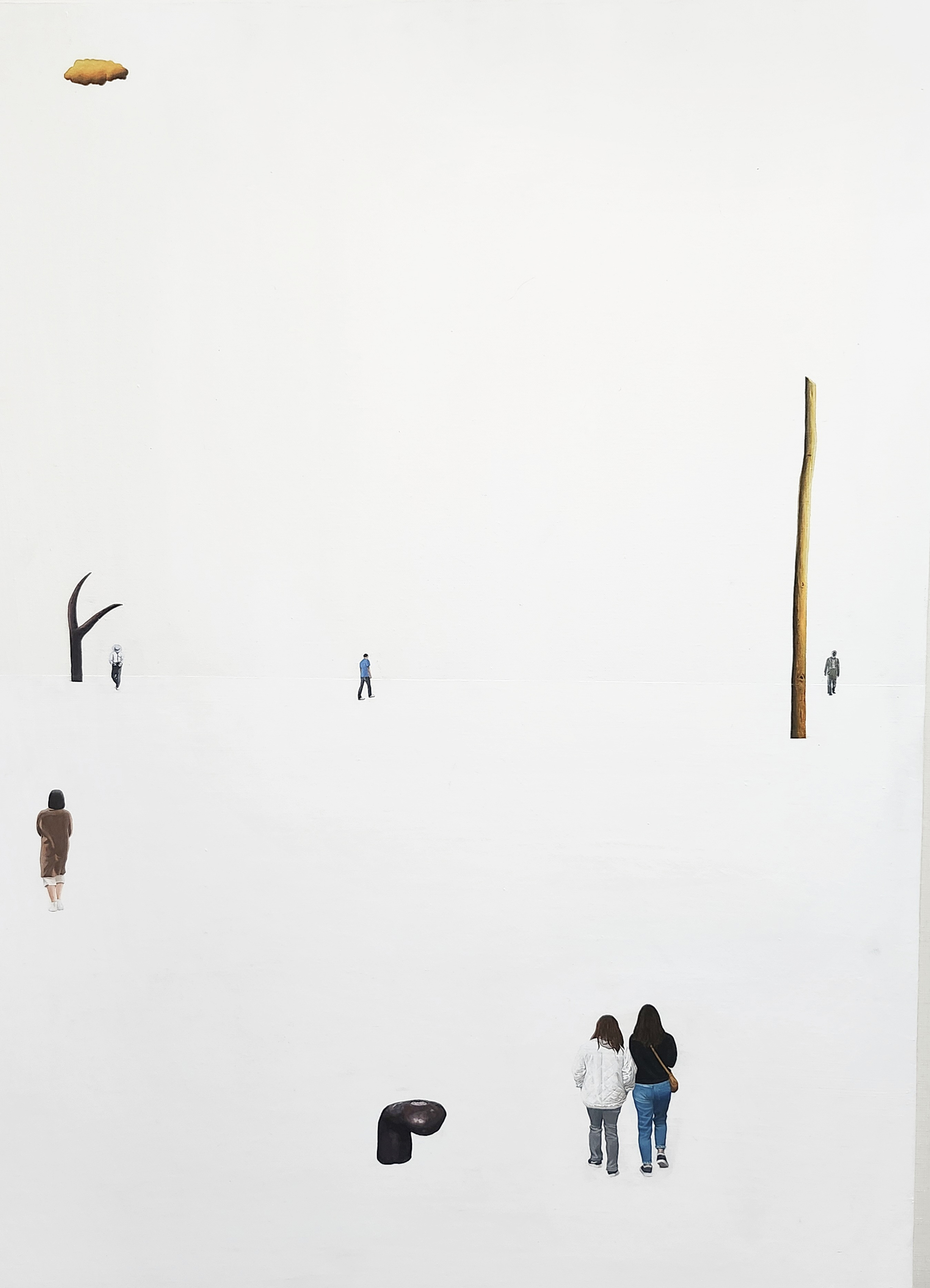 그 틀 안에는 고요하고 차가운 지평선과 함께 이젠 더 이상 자랄 수 없는 문명의 흔적이나 파편들, 세트처럼 구성된 정치화한 콘크리트처럼 보이는 실내 풍경, 그 안에 갇힌 현실적인 인간 군상들, 그것을 전체적으로 바라보는 작가 또는 관객들의 시각이 어우러져 존재한다. 바로 내 앞에서 펼쳐지는 이 풍경들은 나의 시점이자 소통의 몫으로 남겨둔 관객들의 시점일 수도 있다. 무엇을 느끼던 간에 현실적이면서도 비현실적인, 낯선 풍경이면서도 이질적이지 않은 리얼리티한풍경, 불편하지만 불안하지 않은 치유의 공간으로서의 풍경, 그 공간인 이풍경이 나에겐 헤테로토피아이다. ‘사이공간’인 것이다. 또한 어디에도 실존적으로는 존재 하지 않는 풍경 Landscape-Nowhere 이다.