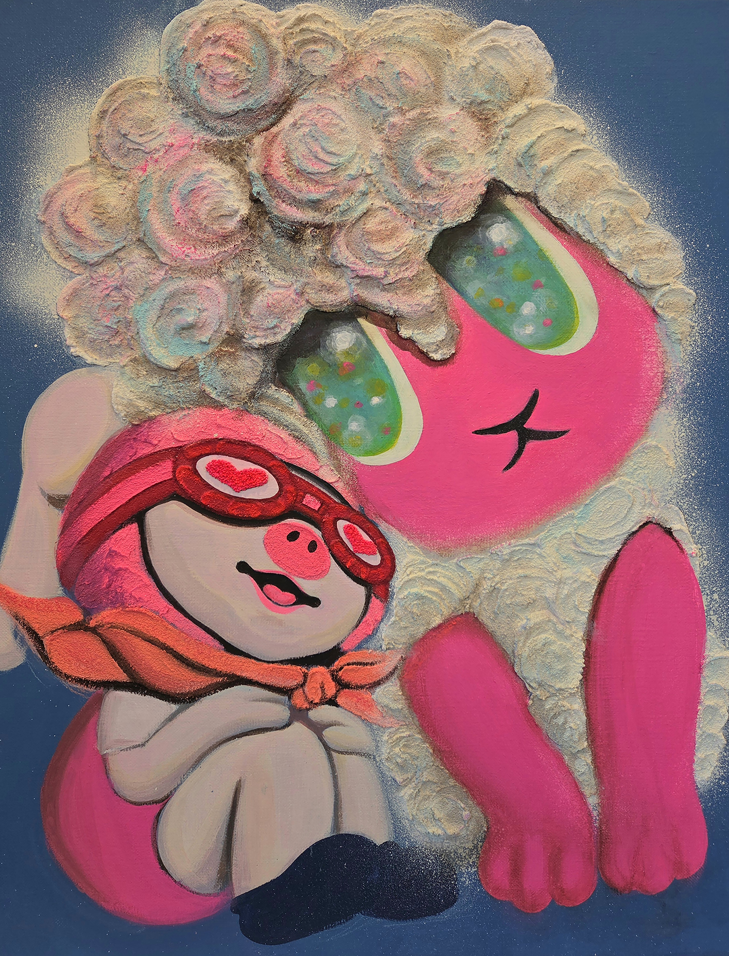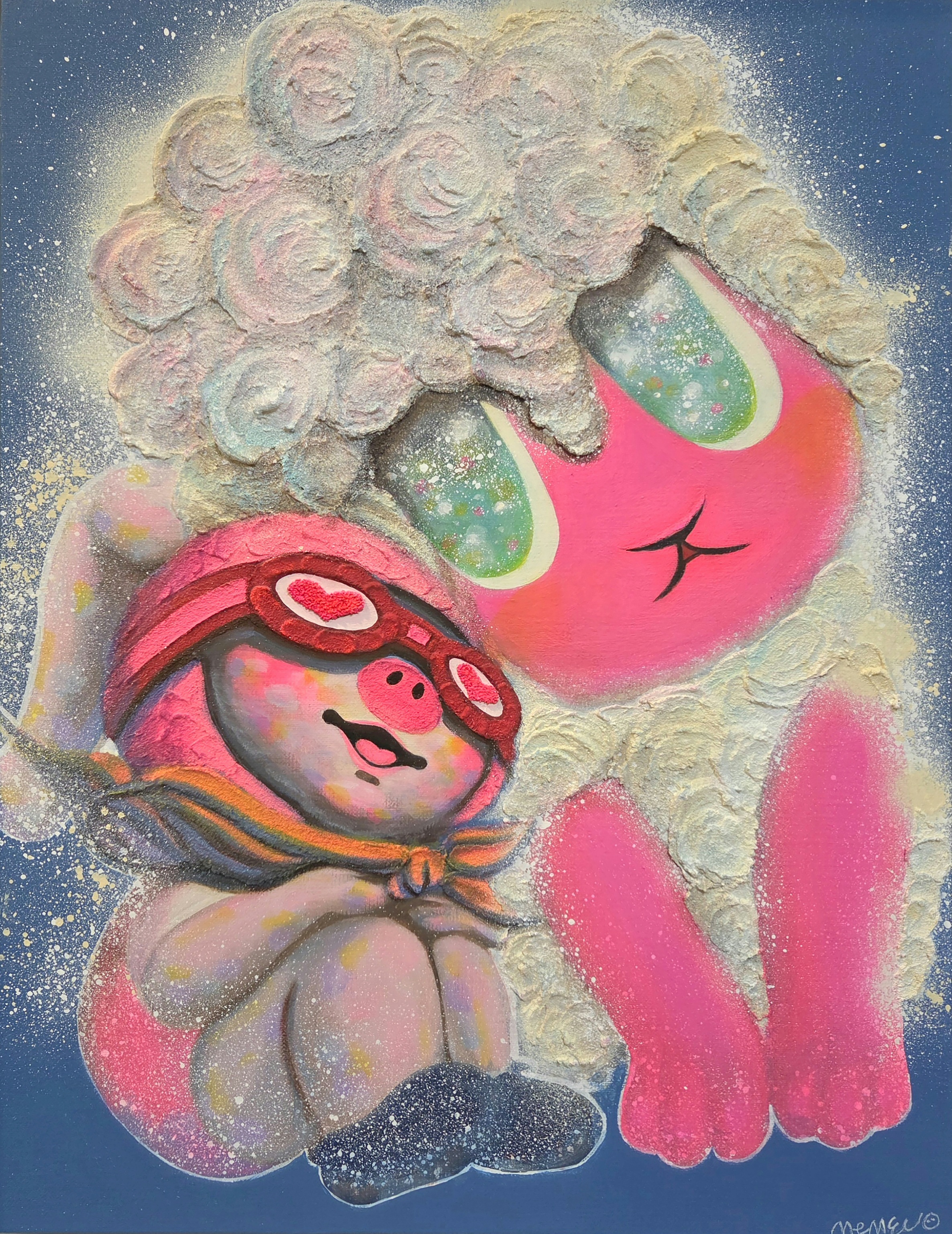 2. 네버랜드를 통과하는 감각과 치유의 미학 미미가 네버랜드 신드롬을 끌어오는 방식은 흔한 판타지적 도피와 다르다. 어린 시절 동물농장에서 보냈던 시간, 타인의 시선을 크게 의식하지 않고 존재할 수 있었던 밝은 감각은 작가에게 하나의 원형으로 남아 있다. 그러나 미미는 그 시절을 단순히 그리워하는 데 머물지 않는다. 네버랜드는 현실을 모르는 척하는 장소가 아니라, 상처 입은 자아가 다시 호흡을 회복하기 위해 잠시 머무는 심리적 공간으로 작동한다. 중요한 것은 돌아가지 않겠다는 결심이 아니라, 머물러 있지 않겠다는 다짐이다. 그래서 미미의 네버랜드는 회귀의 신화가 아니라 통과의 기술이며, 치유를 위한 쉼과 현실을 향한 복귀가 동시에 놓인 장소다. 이 세계를 가장 압축적으로 보여주는 장치가 하트 고글이다. 하트 고글은 현실을 가리는 필터가 아니라 현실을 다른 각도에서 비추는 렌즈에 가깝다. 지친 존재를 잠시 구름 위에 눕혀 쉬게 하고, 무표정한 하루를 무지개빛 장면으로 바꾸는 상상은 현실의 부정이 아니라 현실의 재배치다. 미미는 이 장치를 통해 피로한 일상에 작은 틈을 내고, 그 틈에서 다시 숨을 쉬게 한다. 동시에 하트 고글은 질문의 장치이기도 하다. 왜 우리는 이런 필터를 필요로 하는가, 그리고 그 필터는 언제까지 필요한가. 바로 이 질문 덕분에 PIGME의 환상은 유치한 판타지로 떨어지지 않고, 위안과 비판을 동시에 작동시키는 시각적 언어가 된다. ◆ 메를로 퐁티의 언어를 빌어 미미를 해석해보자. “몸은 세계를 갖는 일반적 매개이다.(The body is our general medium for having a world.)”라는 발언은 미미 회화의 물성을 이해하는 데 꼭 필요한 문장이다. 미미의 달콤한 마띠에르는 단지 예쁜 표면이 아니다. 조소를 오래 해온 작가에게 점성과 두께, 부피와 질감은 오래된 감각의 기억이다. 여기에 아이스크림, 케이크 크림, 젤리 같은 폭신하고 말랑한 촉감의 기억이 더해지며, 화면은 작은 행복의 촉각을 품게 된다. 반복적으로 올리고 말리고 다시 덧입히는 레이어는 감정을 덮어버리는 행위가 아니라 감정이 가라앉고 층이 되는 시간이다. 관객은 이 두꺼운 표면을 눈으로 보면서 동시에 몸으로 상상하게 된다. 말랑한 감촉, 녹아내릴 듯한 밀도, 손끝에 닿을 듯한 표면은 정서를 시각에서 촉각으로 옮긴다. 치유가 단지 의미의 차원이 아니라 감각의 조건이 될 수 있다는 사실이 미미의 화면에서 설득력을 얻는 이유다. 이 감각의 세계는 상징의 세계로도 이어진다. 미미에게 행운과 복은 장식적 요소가 아니라 결핍을 다시 조합하는 믿음의 구조다. 돼지코와 토끼귀는 부족함과 위축의 표지이면서, 동시에 다른 결핍과 결합할 때 새로운 상징이 될 수 있는 가능성의 언어다. 해묘미의 상징이 여기에 더해지면 PIGME는 단순한 혼성 캐릭터를 넘어, 부족함이 오히려 좋은 기운의 구조로 변환될 수 있다는 믿음의 체계가 된다. 그래서 이 세계에서 귀여움은 소비의 표면이 아니라 공존의 프로토콜이 된다. 약함을 감추지 않고, 서로의 약함을 통해 다시 힘을 만드는 구조. 미미의 치유는 바로 이런 관계의 윤리 안에서 더 깊어지고 넓어진다.