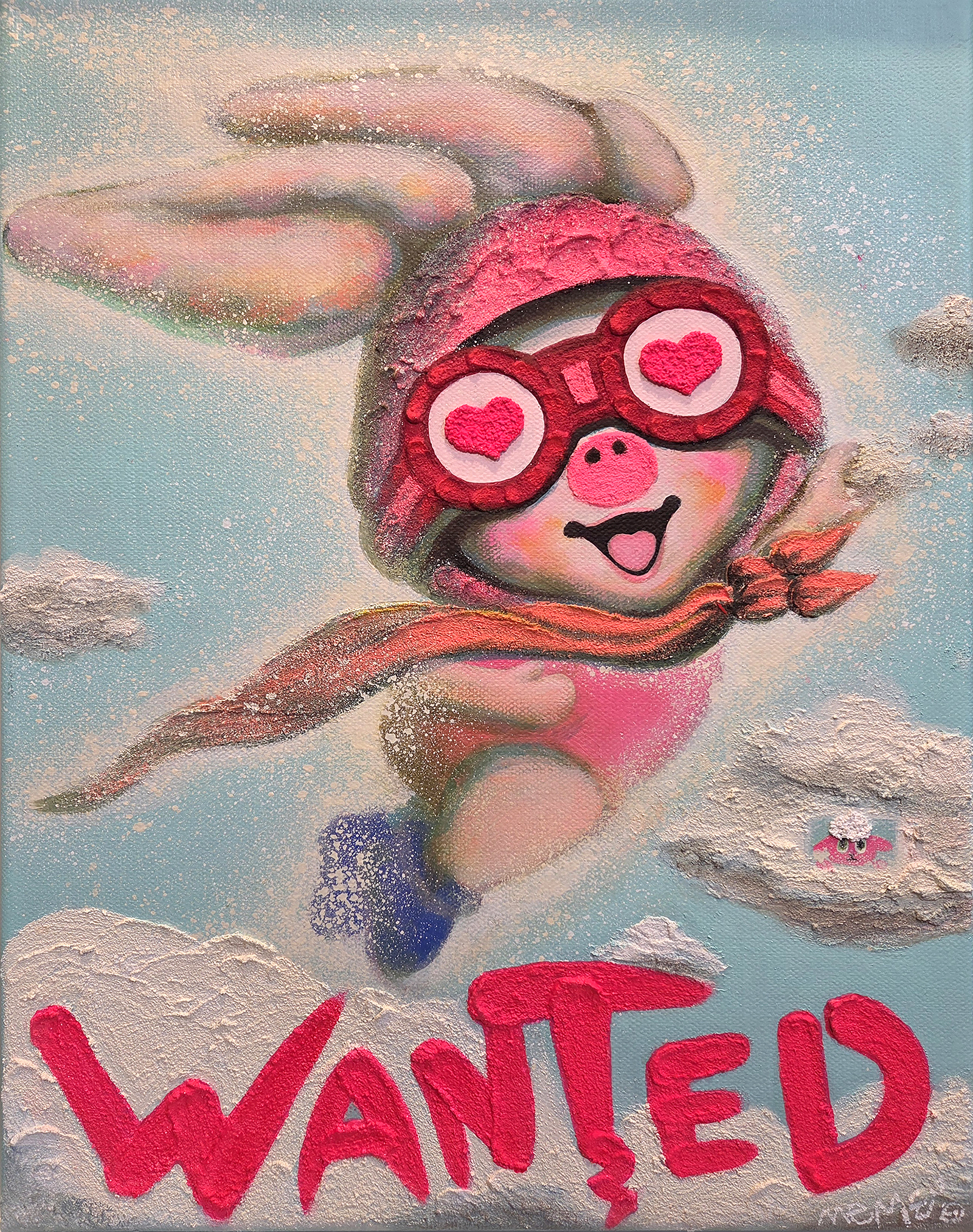 2. 네버랜드를 통과하는 감각과 치유의 미학 미미가 네버랜드 신드롬을 끌어오는 방식은 흔한 판타지적 도피와 다르다. 어린 시절 동물농장에서 보냈던 시간, 타인의 시선을 크게 의식하지 않고 존재할 수 있었던 밝은 감각은 작가에게 하나의 원형으로 남아 있다. 그러나 미미는 그 시절을 단순히 그리워하는 데 머물지 않는다. 네버랜드는 현실을 모르는 척하는 장소가 아니라, 상처 입은 자아가 다시 호흡을 회복하기 위해 잠시 머무는 심리적 공간으로 작동한다. 중요한 것은 돌아가지 않겠다는 결심이 아니라, 머물러 있지 않겠다는 다짐이다. 그래서 미미의 네버랜드는 회귀의 신화가 아니라 통과의 기술이며, 치유를 위한 쉼과 현실을 향한 복귀가 동시에 놓인 장소다. 이 세계를 가장 압축적으로 보여주는 장치가 하트 고글이다. 하트 고글은 현실을 가리는 필터가 아니라 현실을 다른 각도에서 비추는 렌즈에 가깝다. 지친 존재를 잠시 구름 위에 눕혀 쉬게 하고, 무표정한 하루를 무지개빛 장면으로 바꾸는 상상은 현실의 부정이 아니라 현실의 재배치다. 미미는 이 장치를 통해 피로한 일상에 작은 틈을 내고, 그 틈에서 다시 숨을 쉬게 한다. 동시에 하트 고글은 질문의 장치이기도 하다. 왜 우리는 이런 필터를 필요로 하는가, 그리고 그 필터는 언제까지 필요한가. 바로 이 질문 덕분에 PIGME의 환상은 유치한 판타지로 떨어지지 않고, 위안과 비판을 동시에 작동시키는 시각적 언어가 된다. ◆ 메를로 퐁티의 언어를 빌어 미미를 해석해보자. “몸은 세계를 갖는 일반적 매개이다.(The body is our general medium for having a world.)”라는 발언은 미미 회화의 물성을 이해하는 데 꼭 필요한 문장이다. 미미의 달콤한 마띠에르는 단지 예쁜 표면이 아니다. 조소를 오래 해온 작가에게 점성과 두께, 부피와 질감은 오래된 감각의 기억이다. 여기에 아이스크림, 케이크 크림, 젤리 같은 폭신하고 말랑한 촉감의 기억이 더해지며, 화면은 작은 행복의 촉각을 품게 된다. 반복적으로 올리고 말리고 다시 덧입히는 레이어는 감정을 덮어버리는 행위가 아니라 감정이 가라앉고 층이 되는 시간이다. 관객은 이 두꺼운 표면을 눈으로 보면서 동시에 몸으로 상상하게 된다. 말랑한 감촉, 녹아내릴 듯한 밀도, 손끝에 닿을 듯한 표면은 정서를 시각에서 촉각으로 옮긴다. 치유가 단지 의미의 차원이 아니라 감각의 조건이 될 수 있다는 사실이 미미의 화면에서 설득력을 얻는 이유다. 이 감각의 세계는 상징의 세계로도 이어진다. 미미에게 행운과 복은 장식적 요소가 아니라 결핍을 다시 조합하는 믿음의 구조다. 돼지코와 토끼귀는 부족함과 위축의 표지이면서, 동시에 다른 결핍과 결합할 때 새로운 상징이 될 수 있는 가능성의 언어다. 해묘미의 상징이 여기에 더해지면 PIGME는 단순한 혼성 캐릭터를 넘어, 부족함이 오히려 좋은 기운의 구조로 변환될 수 있다는 믿음의 체계가 된다. 그래서 이 세계에서 귀여움은 소비의 표면이 아니라 공존의 프로토콜이 된다. 약함을 감추지 않고, 서로의 약함을 통해 다시 힘을 만드는 구조. 미미의 치유는 바로 이런 관계의 윤리 안에서 더 깊어지고 넓어진다.