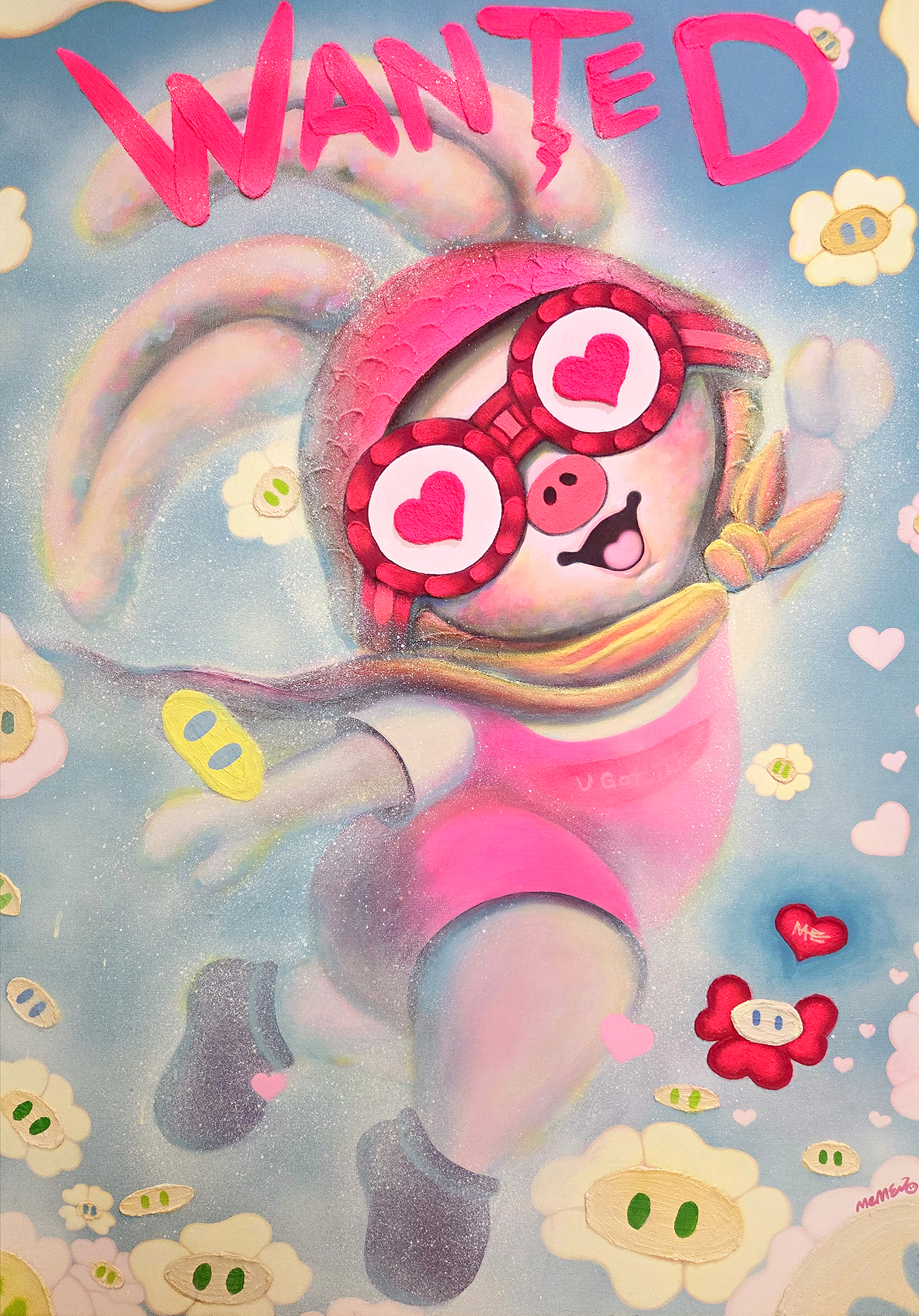 1. 욕망을 다시 묻는 자화상 미미의 작업은 자존을 회복하는 과정에서 시작된 자화상이다. 회사와 가족, 사회 구조 속에서 나라는 주체가 점점 흐려지고, 성실하지만 공허한 일상이 익숙해질수록 미미는 스스로에게 정말 행복한가를 묻게 되었다. 그 질문은 단순한 감정의 확인이 아니라, 지금 붙들고 있는 행복이 과연 나의 선택인지에 대한 점검이었다. 퇴근 후 그림을 그리고, 작은 공간에서 직접 전시를 만들고, 회사의 이름이 아니라 미미라는 이름으로 관객의 반응을 받아내는 과정은 작가에게 삶의 선택권을 되찾는 경험이 되었다. 여기서 행복은 밝은 기분이 아니라 주체를 회복하는 데서 따라오는 감각이 된다. PIGME가 미소 짓는 이유는 세상이 완벽해서가 아니라, 다시 나를 선택하려는 의지가 그 안에 있기 때문이다. 이 자화상은 신체의 상징으로 더 선명해진다. 돼지로 태어났지만 토끼처럼 길게 자란 귀와 작아진 입은 타인의 시선에 대한 과민한 감각과 쉽게 말하지 못하는 위축을 드러낸다. 미미는 사람들이 개와 고양이에는 쉽게 애정을 보내면서도 돼지에게는 좀처럼 호의를 주지 않는다는 사실을 작업의 출발점 가운데 하나로 삼았다. 바로 그 지점에서 덜 사랑받는 존재를 자기 서사의 중심에 세우는 역전이 일어난다. PIGME는 사랑받기 쉬운 존재를 그린 캐릭터가 아니라, 사회적 선호의 바깥에 있던 형상을 다시 의미 있는 존재로 호명하는 장치다. 그러므로 미미의 작업은 귀여움을 생산하는 작업이기 이전에 콤플렉스를 재해석하는 작업이며, 욕망의 표면을 다시 쓰는 작업이다. ◆ 이 질문이 가장 첨예하게 모이는 곳이 <WANTED> 연작이다. 처음의 <WANTED>가 하트 고글로 바라본 행복한 순간을 붙잡아두는 형식이었다면, 시간이 흐르며 이 시리즈는 행복의 이미지보다 욕망의 구조를 묻는 형식으로 바뀌었다. <WANTED 28: Dream of my life>, <WANTED 39: Me time>, <WANTED 40: Forest of ART>와 같은 작품들은 밝고 산뜻한 화면을 펼쳐 보이지만, 실은 내가 원하는 것이 무엇인지, 그 욕망이 정말 나의 것인지 되묻게 만든다. 컬렉터와 시장, 해외 아트페어가 반복해서 <WANTED>를 요구하는 상황 속에서 미미는 행복을 박제하는 작가인 자신이 과연 행복한가를 되묻는다. 이 되물음이야말로 미미 작업의 전환점이다. <WANTED>는 이제 행복의 포스터가 아니라 욕망의 근원을 묻는 질문지가 된다. 리쾨르는 이에 대해 “시간은 이야기의 방식으로 조직될 때 비로소 인간의 시간이 된다. (Time becomes human time to the extent that it is organized after the manner of a narrative.)”고 표현함으로써 미미 작업의 길잡이를 자처한다. 미미에게 자아는 한 번 완성된 정체성이 아니라 계속 다시 써야 하는 이야기다. <WANTED>에서 질문이 발생하고, 이후의 작업에서 그 질문이 현실의 벽과 부딪치며, 다시 조합되고 확장되는 과정은 곧 서사 속에서 갱신되는 자아의 형식이다. 그래서 PIGME는 고정된 캐릭터가 아니라 자기이해를 계속 다시 써나가는 서사적 존재이며, 욕망의 양가성은 그 서사를 움직이는 가장 중요한 동력이다.