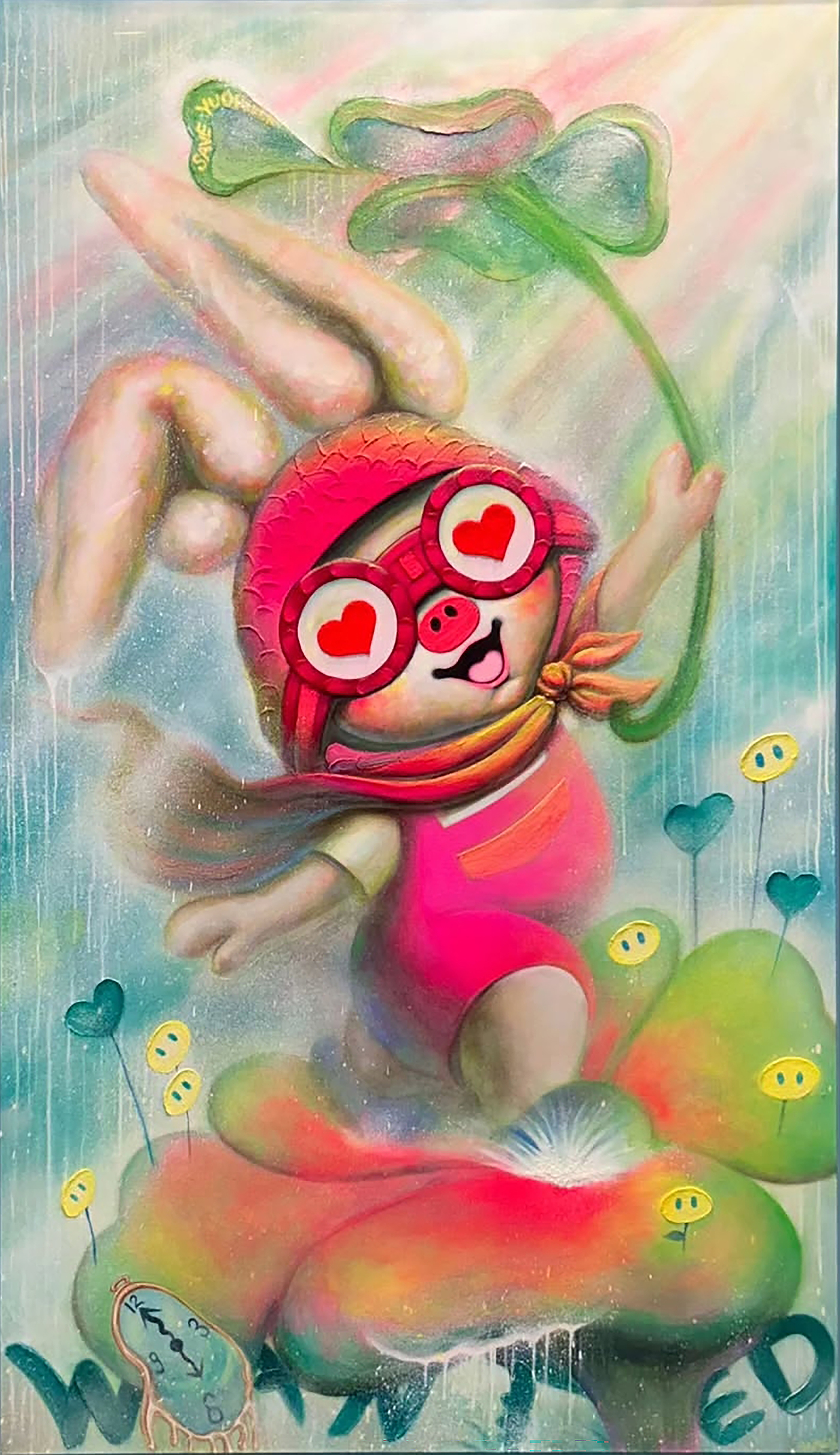 1. 욕망을 다시 묻는 자화상 미미의 작업은 자존을 회복하는 과정에서 시작된 자화상이다. 회사와 가족, 사회 구조 속에서 나라는 주체가 점점 흐려지고, 성실하지만 공허한 일상이 익숙해질수록 미미는 스스로에게 정말 행복한가를 묻게 되었다. 그 질문은 단순한 감정의 확인이 아니라, 지금 붙들고 있는 행복이 과연 나의 선택인지에 대한 점검이었다. 퇴근 후 그림을 그리고, 작은 공간에서 직접 전시를 만들고, 회사의 이름이 아니라 미미라는 이름으로 관객의 반응을 받아내는 과정은 작가에게 삶의 선택권을 되찾는 경험이 되었다. 여기서 행복은 밝은 기분이 아니라 주체를 회복하는 데서 따라오는 감각이 된다. PIGME가 미소 짓는 이유는 세상이 완벽해서가 아니라, 다시 나를 선택하려는 의지가 그 안에 있기 때문이다. 이 자화상은 신체의 상징으로 더 선명해진다. 돼지로 태어났지만 토끼처럼 길게 자란 귀와 작아진 입은 타인의 시선에 대한 과민한 감각과 쉽게 말하지 못하는 위축을 드러낸다. 미미는 사람들이 개와 고양이에는 쉽게 애정을 보내면서도 돼지에게는 좀처럼 호의를 주지 않는다는 사실을 작업의 출발점 가운데 하나로 삼았다. 바로 그 지점에서 덜 사랑받는 존재를 자기 서사의 중심에 세우는 역전이 일어난다. PIGME는 사랑받기 쉬운 존재를 그린 캐릭터가 아니라, 사회적 선호의 바깥에 있던 형상을 다시 의미 있는 존재로 호명하는 장치다. 그러므로 미미의 작업은 귀여움을 생산하는 작업이기 이전에 콤플렉스를 재해석하는 작업이며, 욕망의 표면을 다시 쓰는 작업이다. ◆ 이 질문이 가장 첨예하게 모이는 곳이 <WANTED> 연작이다. 처음의 <WANTED>가 하트 고글로 바라본 행복한 순간을 붙잡아두는 형식이었다면, 시간이 흐르며 이 시리즈는 행복의 이미지보다 욕망의 구조를 묻는 형식으로 바뀌었다. <WANTED 28: Dream of my life>, <WANTED 39: Me time>, <WANTED 40: Forest of ART>와 같은 작품들은 밝고 산뜻한 화면을 펼쳐 보이지만, 실은 내가 원하는 것이 무엇인지, 그 욕망이 정말 나의 것인지 되묻게 만든다. 컬렉터와 시장, 해외 아트페어가 반복해서 <WANTED>를 요구하는 상황 속에서 미미는 행복을 박제하는 작가인 자신이 과연 행복한가를 되묻는다. 이 되물음이야말로 미미 작업의 전환점이다. <WANTED>는 이제 행복의 포스터가 아니라 욕망의 근원을 묻는 질문지가 된다. 리쾨르는 이에 대해 “시간은 이야기의 방식으로 조직될 때 비로소 인간의 시간이 된다. (Time becomes human time to the extent that it is organized after the manner of a narrative.)”고 표현함으로써 미미 작업의 길잡이를 자처한다. 미미에게 자아는 한 번 완성된 정체성이 아니라 계속 다시 써야 하는 이야기다. <WANTED>에서 질문이 발생하고, 이후의 작업에서 그 질문이 현실의 벽과 부딪치며, 다시 조합되고 확장되는 과정은 곧 서사 속에서 갱신되는 자아의 형식이다. 그래서 PIGME는 고정된 캐릭터가 아니라 자기이해를 계속 다시 써나가는 서사적 존재이며, 욕망의 양가성은 그 서사를 움직이는 가장 중요한 동력이다.