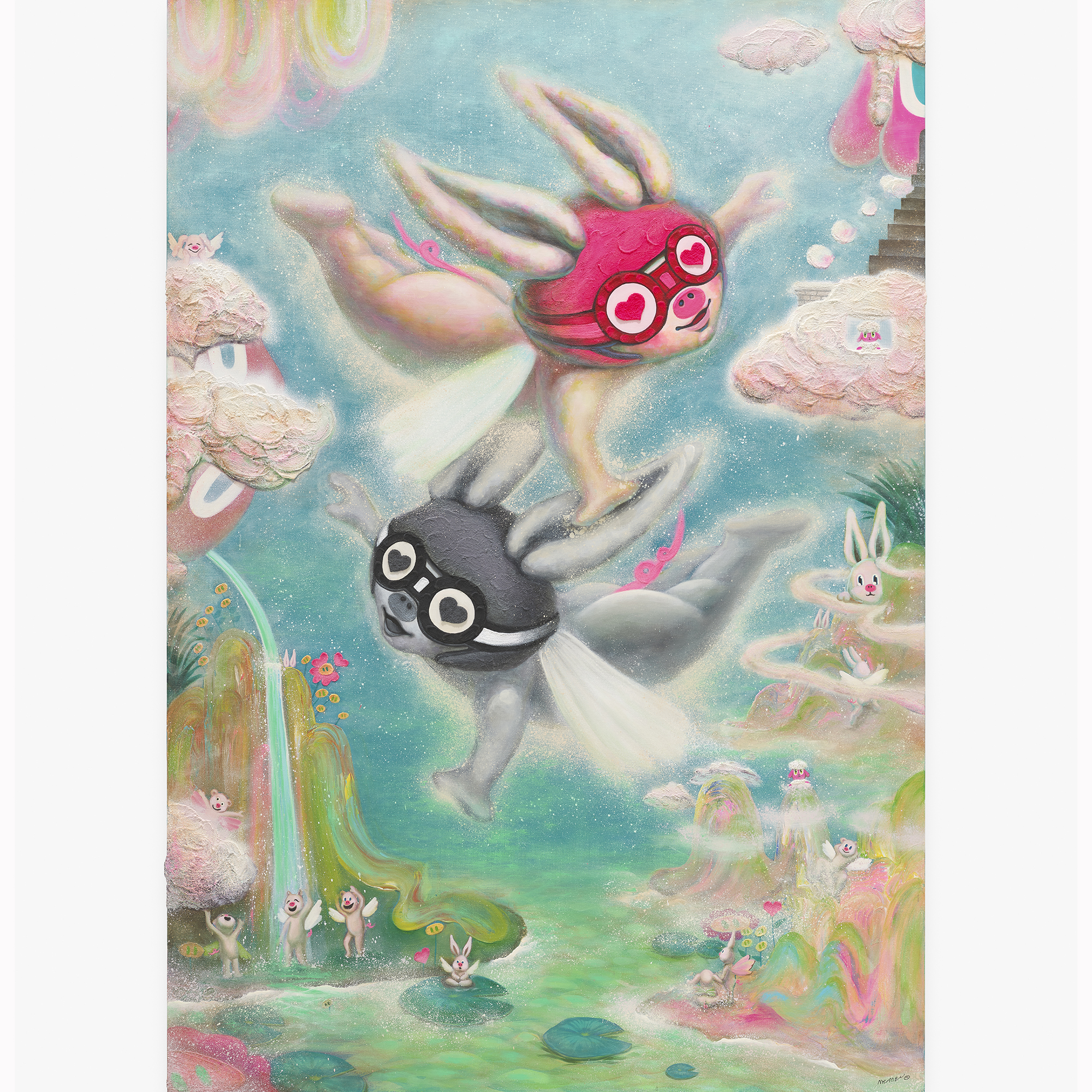 2. 네버랜드를 통과하는 감각과 치유의 미학 미미가 네버랜드 신드롬을 끌어오는 방식은 흔한 판타지적 도피와 다르다. 어린 시절 동물농장에서 보냈던 시간, 타인의 시선을 크게 의식하지 않고 존재할 수 있었던 밝은 감각은 작가에게 하나의 원형으로 남아 있다. 그러나 미미는 그 시절을 단순히 그리워하는 데 머물지 않는다. 네버랜드는 현실을 모르는 척하는 장소가 아니라, 상처 입은 자아가 다시 호흡을 회복하기 위해 잠시 머무는 심리적 공간으로 작동한다. 중요한 것은 돌아가지 않겠다는 결심이 아니라, 머물러 있지 않겠다는 다짐이다. 그래서 미미의 네버랜드는 회귀의 신화가 아니라 통과의 기술이며, 치유를 위한 쉼과 현실을 향한 복귀가 동시에 놓인 장소다. 이 세계를 가장 압축적으로 보여주는 장치가 하트 고글이다. 하트 고글은 현실을 가리는 필터가 아니라 현실을 다른 각도에서 비추는 렌즈에 가깝다. 지친 존재를 잠시 구름 위에 눕혀 쉬게 하고, 무표정한 하루를 무지개빛 장면으로 바꾸는 상상은 현실의 부정이 아니라 현실의 재배치다. 미미는 이 장치를 통해 피로한 일상에 작은 틈을 내고, 그 틈에서 다시 숨을 쉬게 한다. 동시에 하트 고글은 질문의 장치이기도 하다. 왜 우리는 이런 필터를 필요로 하는가, 그리고 그 필터는 언제까지 필요한가. 바로 이 질문 덕분에 PIGME의 환상은 유치한 판타지로 떨어지지 않고, 위안과 비판을 동시에 작동시키는 시각적 언어가 된다. ◆ 메를로 퐁티의 언어를 빌어 미미를 해석해보자. “몸은 세계를 갖는 일반적 매개이다.(The body is our general medium for having a world.)”라는 발언은 미미 회화의 물성을 이해하는 데 꼭 필요한 문장이다. 미미의 달콤한 마띠에르는 단지 예쁜 표면이 아니다. 조소를 오래 해온 작가에게 점성과 두께, 부피와 질감은 오래된 감각의 기억이다. 여기에 아이스크림, 케이크 크림, 젤리 같은 폭신하고 말랑한 촉감의 기억이 더해지며, 화면은 작은 행복의 촉각을 품게 된다. 반복적으로 올리고 말리고 다시 덧입히는 레이어는 감정을 덮어버리는 행위가 아니라 감정이 가라앉고 층이 되는 시간이다. 관객은 이 두꺼운 표면을 눈으로 보면서 동시에 몸으로 상상하게 된다. 말랑한 감촉, 녹아내릴 듯한 밀도, 손끝에 닿을 듯한 표면은 정서를 시각에서 촉각으로 옮긴다. 치유가 단지 의미의 차원이 아니라 감각의 조건이 될 수 있다는 사실이 미미의 화면에서 설득력을 얻는 이유다. 이 감각의 세계는 상징의 세계로도 이어진다. 미미에게 행운과 복은 장식적 요소가 아니라 결핍을 다시 조합하는 믿음의 구조다. 돼지코와 토끼귀는 부족함과 위축의 표지이면서, 동시에 다른 결핍과 결합할 때 새로운 상징이 될 수 있는 가능성의 언어다. 해묘미의 상징이 여기에 더해지면 PIGME는 단순한 혼성 캐릭터를 넘어, 부족함이 오히려 좋은 기운의 구조로 변환될 수 있다는 믿음의 체계가 된다. 그래서 이 세계에서 귀여움은 소비의 표면이 아니라 공존의 프로토콜이 된다. 약함을 감추지 않고, 서로의 약함을 통해 다시 힘을 만드는 구조. 미미의 치유는 바로 이런 관계의 윤리 안에서 더 깊어지고 넓어진다.