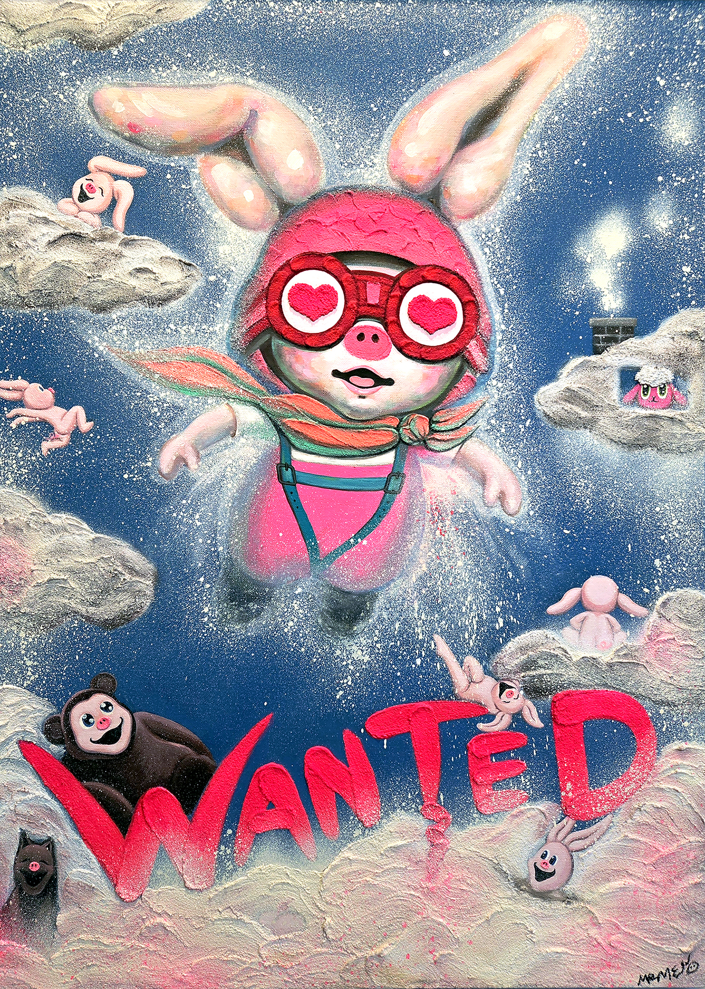 1. 욕망을 다시 묻는 자화상 미미의 작업은 자존을 회복하는 과정에서 시작된 자화상이다. 회사와 가족, 사회 구조 속에서 나라는 주체가 점점 흐려지고, 성실하지만 공허한 일상이 익숙해질수록 미미는 스스로에게 정말 행복한가를 묻게 되었다. 그 질문은 단순한 감정의 확인이 아니라, 지금 붙들고 있는 행복이 과연 나의 선택인지에 대한 점검이었다. 퇴근 후 그림을 그리고, 작은 공간에서 직접 전시를 만들고, 회사의 이름이 아니라 미미라는 이름으로 관객의 반응을 받아내는 과정은 작가에게 삶의 선택권을 되찾는 경험이 되었다. 여기서 행복은 밝은 기분이 아니라 주체를 회복하는 데서 따라오는 감각이 된다. PIGME가 미소 짓는 이유는 세상이 완벽해서가 아니라, 다시 나를 선택하려는 의지가 그 안에 있기 때문이다. 이 자화상은 신체의 상징으로 더 선명해진다. 돼지로 태어났지만 토끼처럼 길게 자란 귀와 작아진 입은 타인의 시선에 대한 과민한 감각과 쉽게 말하지 못하는 위축을 드러낸다. 미미는 사람들이 개와 고양이에는 쉽게 애정을 보내면서도 돼지에게는 좀처럼 호의를 주지 않는다는 사실을 작업의 출발점 가운데 하나로 삼았다. 바로 그 지점에서 덜 사랑받는 존재를 자기 서사의 중심에 세우는 역전이 일어난다. PIGME는 사랑받기 쉬운 존재를 그린 캐릭터가 아니라, 사회적 선호의 바깥에 있던 형상을 다시 의미 있는 존재로 호명하는 장치다. 그러므로 미미의 작업은 귀여움을 생산하는 작업이기 이전에 콤플렉스를 재해석하는 작업이며, 욕망의 표면을 다시 쓰는 작업이다. ◆ 이 질문이 가장 첨예하게 모이는 곳이 <WANTED> 연작이다. 처음의 <WANTED>가 하트 고글로 바라본 행복한 순간을 붙잡아두는 형식이었다면, 시간이 흐르며 이 시리즈는 행복의 이미지보다 욕망의 구조를 묻는 형식으로 바뀌었다. <WANTED 28: Dream of my life>, <WANTED 39: Me time>, <WANTED 40: Forest of ART>와 같은 작품들은 밝고 산뜻한 화면을 펼쳐 보이지만, 실은 내가 원하는 것이 무엇인지, 그 욕망이 정말 나의 것인지 되묻게 만든다. 컬렉터와 시장, 해외 아트페어가 반복해서 <WANTED>를 요구하는 상황 속에서 미미는 행복을 박제하는 작가인 자신이 과연 행복한가를 되묻는다. 이 되물음이야말로 미미 작업의 전환점이다. <WANTED>는 이제 행복의 포스터가 아니라 욕망의 근원을 묻는 질문지가 된다. 리쾨르는 이에 대해 “시간은 이야기의 방식으로 조직될 때 비로소 인간의 시간이 된다. (Time becomes human time to the extent that it is organized after the manner of a narrative.)”고 표현함으로써 미미 작업의 길잡이를 자처한다. 미미에게 자아는 한 번 완성된 정체성이 아니라 계속 다시 써야 하는 이야기다. <WANTED>에서 질문이 발생하고, 이후의 작업에서 그 질문이 현실의 벽과 부딪치며, 다시 조합되고 확장되는 과정은 곧 서사 속에서 갱신되는 자아의 형식이다. 그래서 PIGME는 고정된 캐릭터가 아니라 자기이해를 계속 다시 써나가는 서사적 존재이며, 욕망의 양가성은 그 서사를 움직이는 가장 중요한 동력이다.