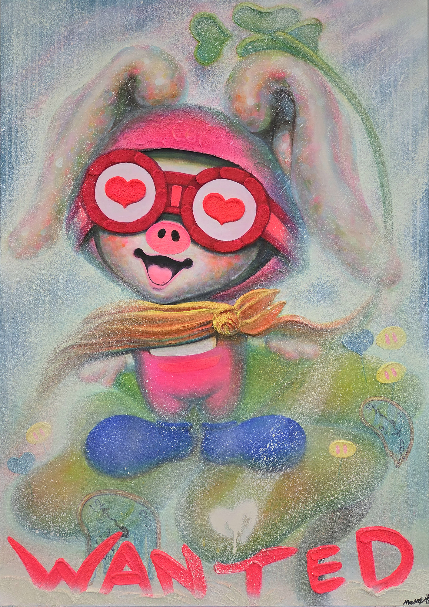 1. 욕망을 다시 묻는 자화상 미미의 작업은 자존을 회복하는 과정에서 시작된 자화상이다. 회사와 가족, 사회 구조 속에서 나라는 주체가 점점 흐려지고, 성실하지만 공허한 일상이 익숙해질수록 미미는 스스로에게 정말 행복한가를 묻게 되었다. 그 질문은 단순한 감정의 확인이 아니라, 지금 붙들고 있는 행복이 과연 나의 선택인지에 대한 점검이었다. 퇴근 후 그림을 그리고, 작은 공간에서 직접 전시를 만들고, 회사의 이름이 아니라 미미라는 이름으로 관객의 반응을 받아내는 과정은 작가에게 삶의 선택권을 되찾는 경험이 되었다. 여기서 행복은 밝은 기분이 아니라 주체를 회복하는 데서 따라오는 감각이 된다. PIGME가 미소 짓는 이유는 세상이 완벽해서가 아니라, 다시 나를 선택하려는 의지가 그 안에 있기 때문이다. 이 자화상은 신체의 상징으로 더 선명해진다. 돼지로 태어났지만 토끼처럼 길게 자란 귀와 작아진 입은 타인의 시선에 대한 과민한 감각과 쉽게 말하지 못하는 위축을 드러낸다. 미미는 사람들이 개와 고양이에는 쉽게 애정을 보내면서도 돼지에게는 좀처럼 호의를 주지 않는다는 사실을 작업의 출발점 가운데 하나로 삼았다. 바로 그 지점에서 덜 사랑받는 존재를 자기 서사의 중심에 세우는 역전이 일어난다. PIGME는 사랑받기 쉬운 존재를 그린 캐릭터가 아니라, 사회적 선호의 바깥에 있던 형상을 다시 의미 있는 존재로 호명하는 장치다. 그러므로 미미의 작업은 귀여움을 생산하는 작업이기 이전에 콤플렉스를 재해석하는 작업이며, 욕망의 표면을 다시 쓰는 작업이다. ◆ 이 질문이 가장 첨예하게 모이는 곳이 <WANTED> 연작이다. 처음의 <WANTED>가 하트 고글로 바라본 행복한 순간을 붙잡아두는 형식이었다면, 시간이 흐르며 이 시리즈는 행복의 이미지보다 욕망의 구조를 묻는 형식으로 바뀌었다. <WANTED 28: Dream of my life>, <WANTED 39: Me time>, <WANTED 40: Forest of ART>와 같은 작품들은 밝고 산뜻한 화면을 펼쳐 보이지만, 실은 내가 원하는 것이 무엇인지, 그 욕망이 정말 나의 것인지 되묻게 만든다. 컬렉터와 시장, 해외 아트페어가 반복해서 <WANTED>를 요구하는 상황 속에서 미미는 행복을 박제하는 작가인 자신이 과연 행복한가를 되묻는다. 이 되물음이야말로 미미 작업의 전환점이다. <WANTED>는 이제 행복의 포스터가 아니라 욕망의 근원을 묻는 질문지가 된다. 리쾨르는 이에 대해 “시간은 이야기의 방식으로 조직될 때 비로소 인간의 시간이 된다. (Time becomes human time to the extent that it is organized after the manner of a narrative.)”고 표현함으로써 미미 작업의 길잡이를 자처한다. 미미에게 자아는 한 번 완성된 정체성이 아니라 계속 다시 써야 하는 이야기다. <WANTED>에서 질문이 발생하고, 이후의 작업에서 그 질문이 현실의 벽과 부딪치며, 다시 조합되고 확장되는 과정은 곧 서사 속에서 갱신되는 자아의 형식이다. 그래서 PIGME는 고정된 캐릭터가 아니라 자기이해를 계속 다시 써나가는 서사적 존재이며, 욕망의 양가성은 그 서사를 움직이는 가장 중요한 동력이다.