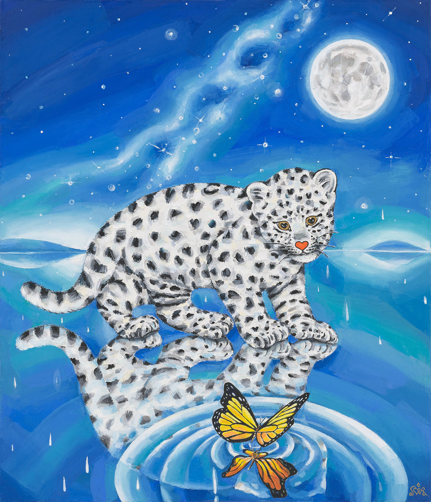 누구에게나 가슴 속에 자신만의 파라다이스가 있다. 나의 낙원에는 달빛 아래 사랑스러운 흰 표범들이 신비로운 동식물과 어울려 노닐고 있다. 당신은 어떠한가? 그림 속 오아시스에 비친 당신을 마주하고, 묻어두었던 비밀의 파라다이스에 작은 파동이 일었으면 좋겠다. 흔들리는 삶의 여정에 우연히 발견한 보물 지도를 만난 것처럼 말이다.