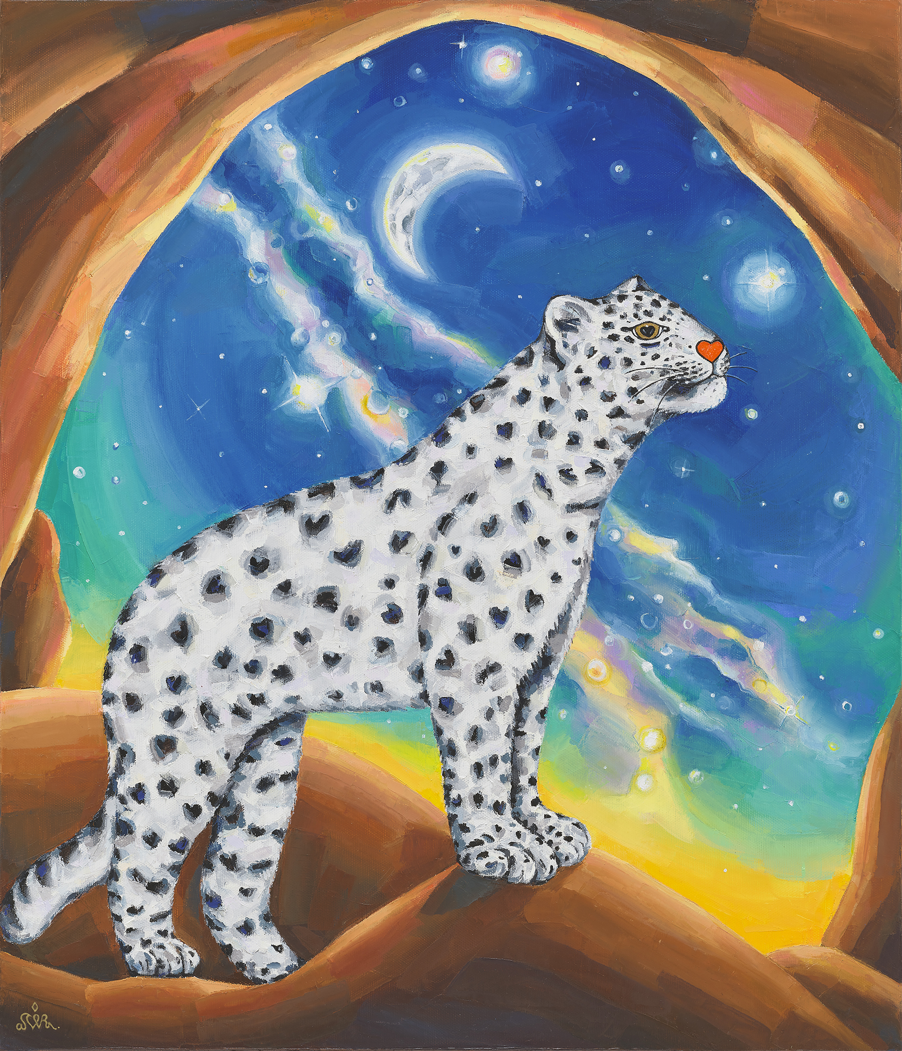 그가 도달한 궁극의 도착지는 드넓은 고원 사이로 만개한 꽃과 적도의 식물이 길게 뻗은 ‘오아시스’이다. 그곳에는 신성한 동물들이 노니는데, 주인공인 흰 표범들이 금빛 눈에 하트 모양 붉은 코를 하고 여행자를 마중한다. 아기 표범들은 오아시스에서 수영을 배우고 나무를 타며 오후를 보낸다. 검은 표범은 흰 표범의 연인이자 친구로 등장한다. 그들은 낙원을 지키는 유일한 맹수이자 사랑스러운 수호자이다. 표범의 코가 하트 모양으로 변한 것은 싸울 일이 없어 사랑스러워진 모습을 표현한 것으로, 영원한 행복과 사랑이 존재하는 유토피아적 세계관을 나타낸다.