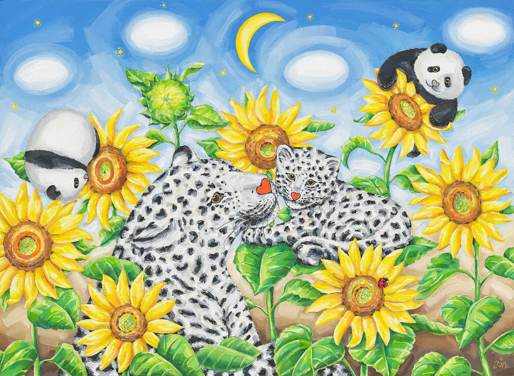 그가 도달한 궁극의 도착지는 드넓은 고원 사이로 만개한 꽃과 적도의 식물이 길게 뻗은 ‘오아시스’이다. 그곳에는 신성한 동물들이 노니는데, 주인공인 흰 표범들이 금빛 눈에 하트 모양 붉은 코를 하고 여행자를 마중한다. 아기 표범들은 오아시스에서 수영을 배우고 나무를 타며 오후를 보낸다. 검은 표범은 흰 표범의 연인이자 친구로 등장한다. 그들은 낙원을 지키는 유일한 맹수이자 사랑스러운 수호자이다. 표범의 코가 하트 모양으로 변한 것은 싸울 일이 없어 사랑스러워진 모습을 표현한 것으로, 영원한 행복과 사랑이 존재하는 유토피아적 세계관을 나타낸다.