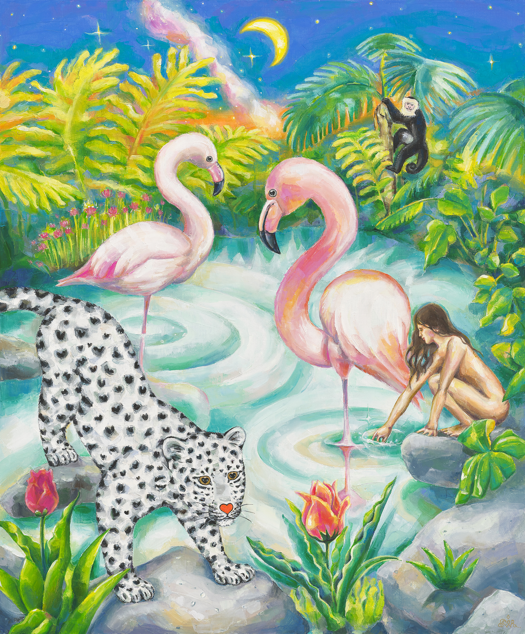 누구에게나 가슴 속에 자신만의 파라다이스가 있다. 나의 낙원에는 달빛 아래 사랑스러운 흰 표범들이 신비로운 동식물과 어울려 노닐고 있다. 당신은 어떠한가? 그림 속 오아시스에 비친 당신을 마주하고, 묻어두었던 비밀의 파라다이스에 작은 파동이 일었으면 좋겠다. 흔들리는 삶의 여정에 우연히 발견한 보물 지도를 만난 것처럼 말이다.
