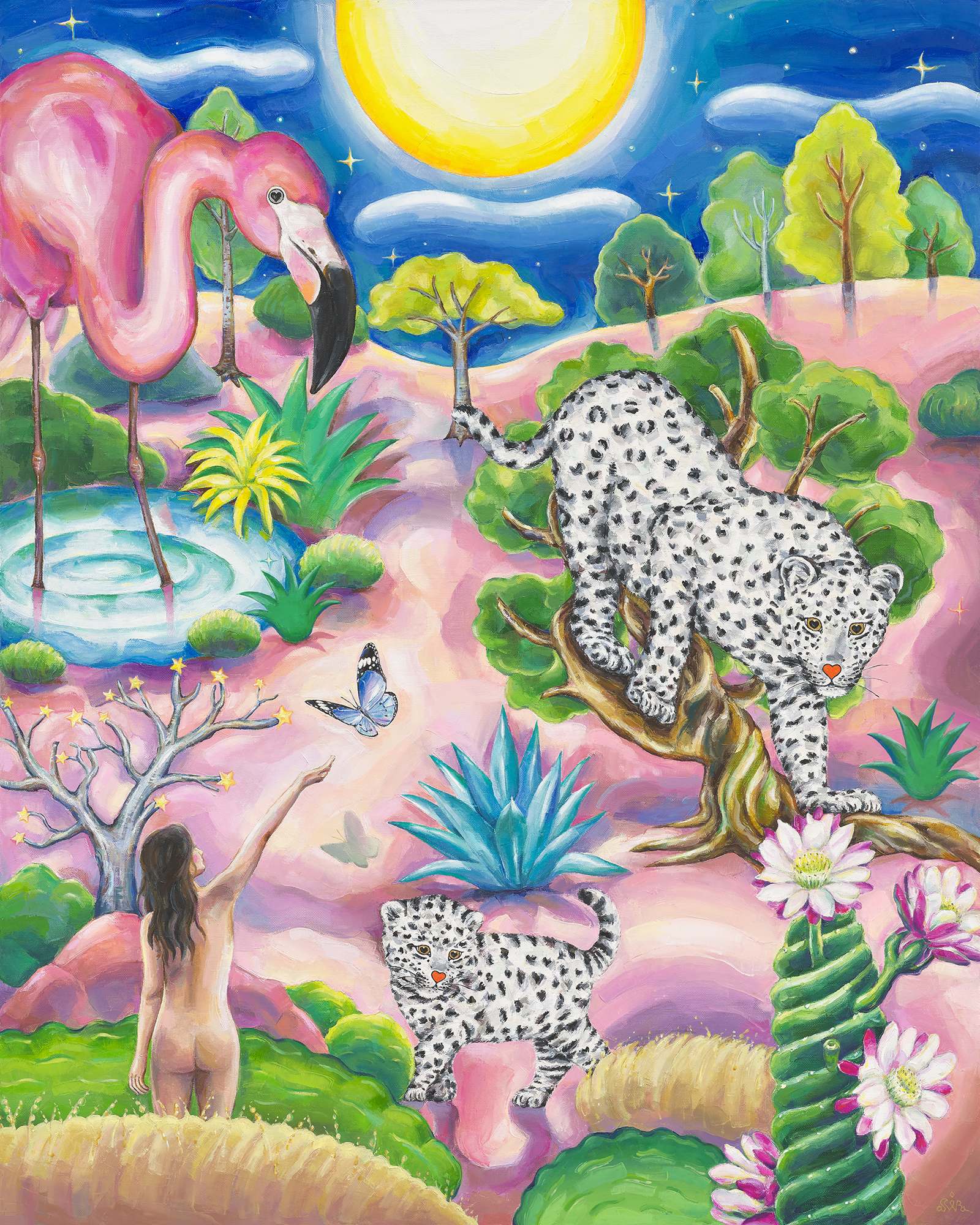 누구에게나 가슴 속에 자신만의 파라다이스가 있다. 나의 낙원에는 달빛 아래 사랑스러운 흰 표범들이 신비로운 동식물과 어울려 노닐고 있다. 당신은 어떠한가? 그림 속 오아시스에 비친 당신을 마주하고, 묻어두었던 비밀의 파라다이스에 작은 파동이 일었으면 좋겠다. 흔들리는 삶의 여정에 우연히 발견한 보물 지도를 만난 것처럼 말이다.