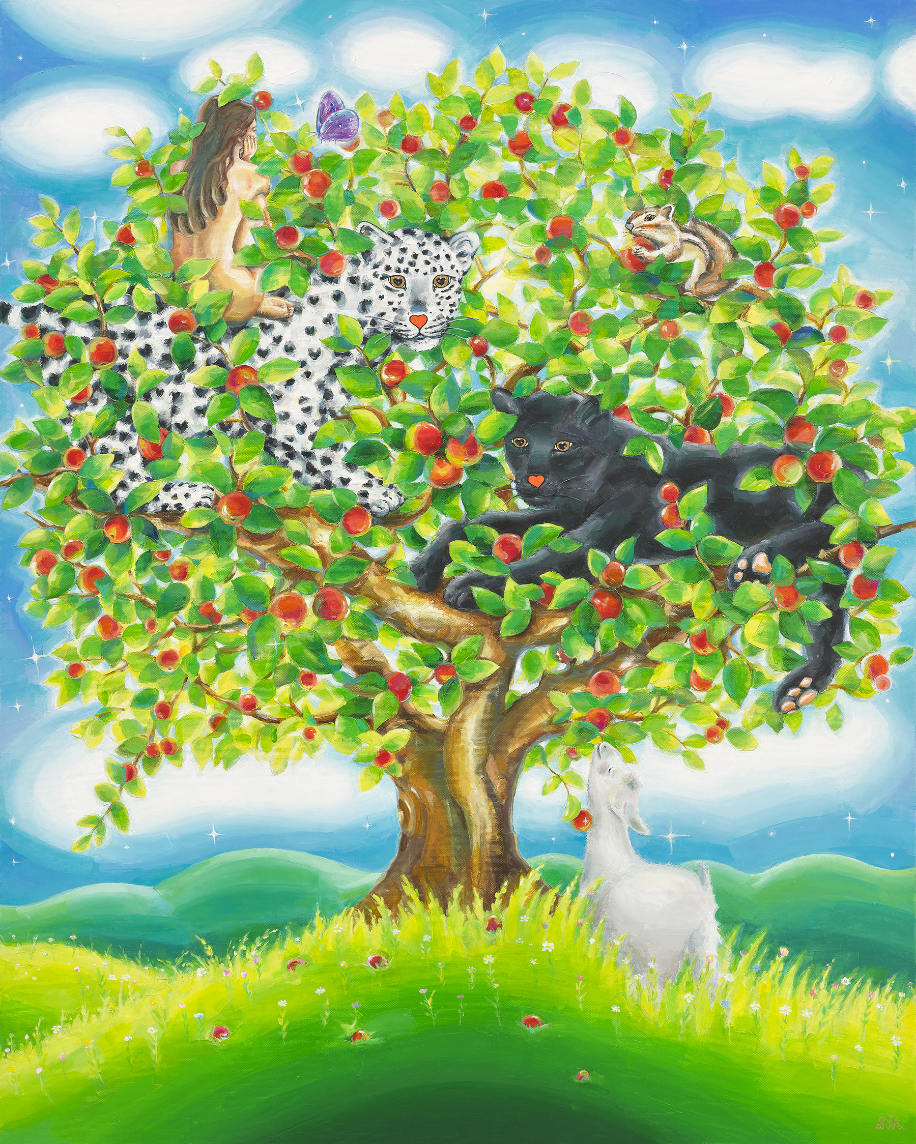 누구에게나 가슴 속에 자신만의 파라다이스가 있다. 나의 낙원에는 달빛 아래 사랑스러운 흰 표범들이 신비로운 동식물과 어울려 노닐고 있다. 당신은 어떠한가? 그림 속 오아시스에 비친 당신을 마주하고, 묻어두었던 비밀의 파라다이스에 작은 파동이 일었으면 좋겠다. 흔들리는 삶의 여정에 우연히 발견한 보물 지도를 만난 것처럼 말이다.