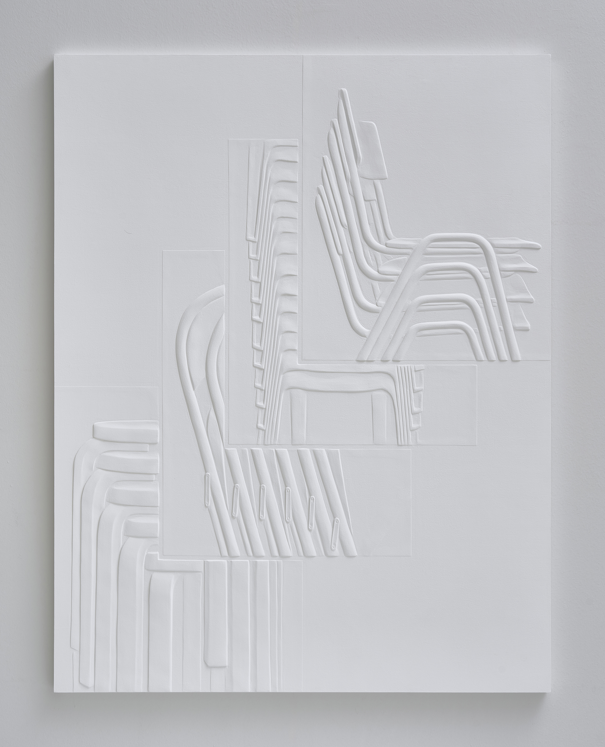 본 전시의 연작 「중첩된 자리」에서 의자는 화면 속에서 때로는 쌓여 있고, 때로는 펼쳐진 형태로 등장한다. 동일한 모양의 의자들이 켜켜이 쌓여 서로에게 기대고 있는 장면은 일률적인 외형을 지니고 있지만, 그 반복의 틈에서 오히려 서로 다른 형상으로도 보인다. 하나의 의자가 놓여 있을 때에는 지나치게 익숙하고 평범한 사물처럼 보이지만, 그것들이 층층이 쌓인 순간은 마치 불안정한 탑처럼 위태롭게 흔들린다.