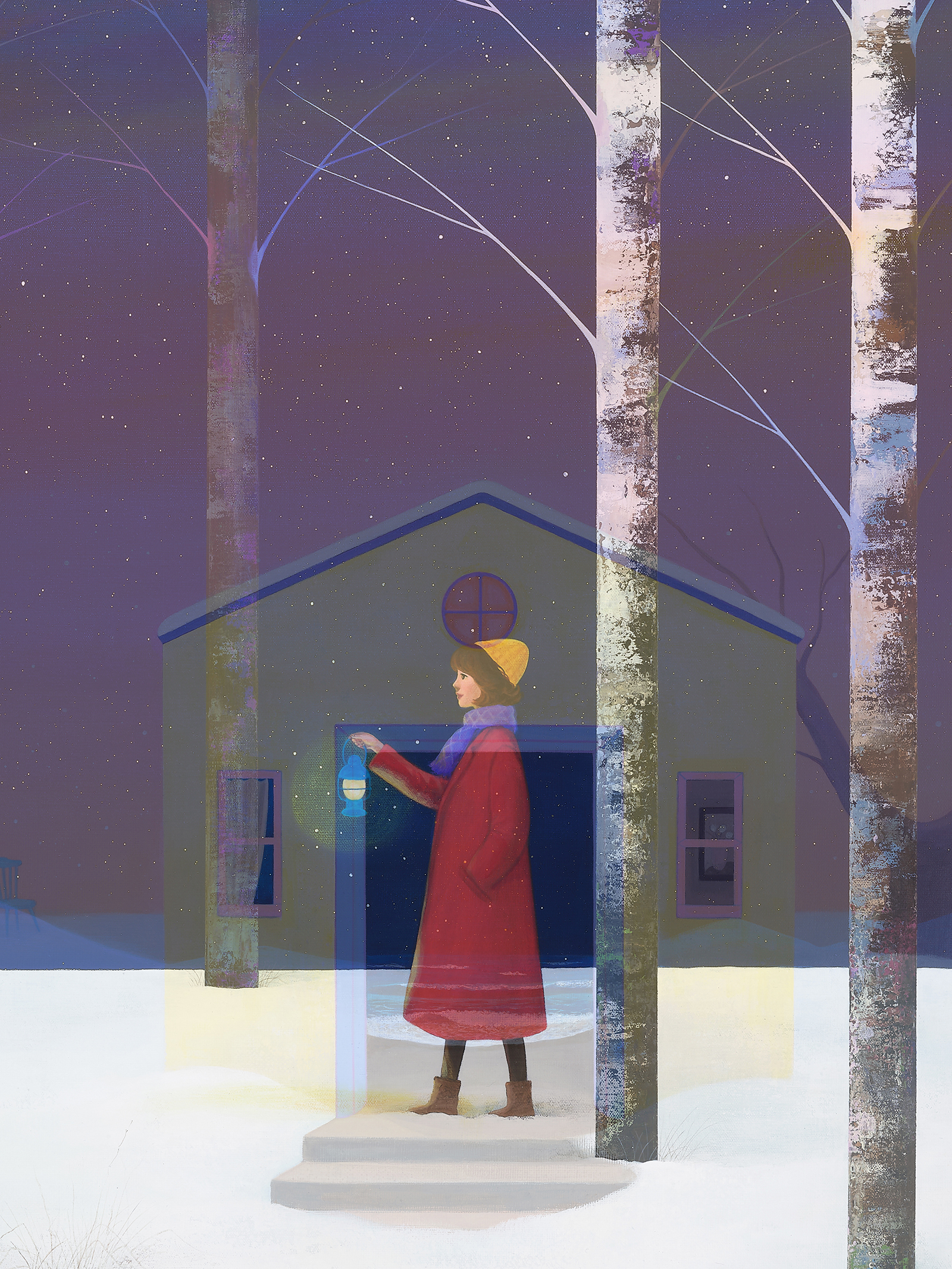 안소영의 작업을 관통하는 또 하나의 특징은 동일한 모티프가 여러 시리즈를 통해 끊임없이 재맥락화된다는 점이다. <집, 안식처>는 초기부터 이어져 온 가장 오래된 시리즈로, 2024년의 대작 <집, 안식처 10>과<Plastic city_Pink>의 병치는 현실적 공간과 이상적 공간, 혹은 도시와 자연의 긴장 관계를 보여준다. 이는 <동이 트기 전에> 시리즈가 대표하는 새벽의 고요와, <내가 너에게 갈게> 시리즈가 대표하는 그리움의 정서와 교차하며 풍부한 층위를 형성한다. 매체적 확장 또한 주목할 만하다. 2024년부터 본격화된 렌티큘러(Lenticular) 기법의 <되찾은 집> 시리즈는 집과 소녀, 혹은 두 개의 기억이 하나의 화면에서 겹쳐지며 ‘여행하는 자’와 ‘안식하는 장소’의 이분법을 해체한다. 이는 작가가 “물리적 공간인 집으로 갈 순 없지만, 마음에 평화가 생기니 더 이상 장소로서 안식처는 무의미해진다”고 고백한 지점을 시각적으로 증명하는 성과다. 하나의 화면 안에 복수의 이미지를 중첩시키는 이 방식은 고정된 회화의 시간을 해체하고, 지각의 시간성을 적극적으로 개입시킨다. 2026년 선보이는 <백지위임장에 관한 단상>(르네 마그리트(René Magritte, 1898-1967)의 <백지위임장> 오마주)은 이러한 확장의 정점에 위치한다. 마그리트 특유의 철학적 역설과 환상성을 차용하면서도, 안소영 특유의 동화적 색감과 소녀의 시선을 통해 ‘기억’과 ‘현실’, ‘이미지’와 ‘존재’의 경계를 다시 질문한다. 이는 작가가 ‘자기만의 여행’이라는 주제를 타자의 예술사적 텍스트와 대화시키며, 자신의 작업을 더욱 보편적인 층위로 확장시키는 시도다.