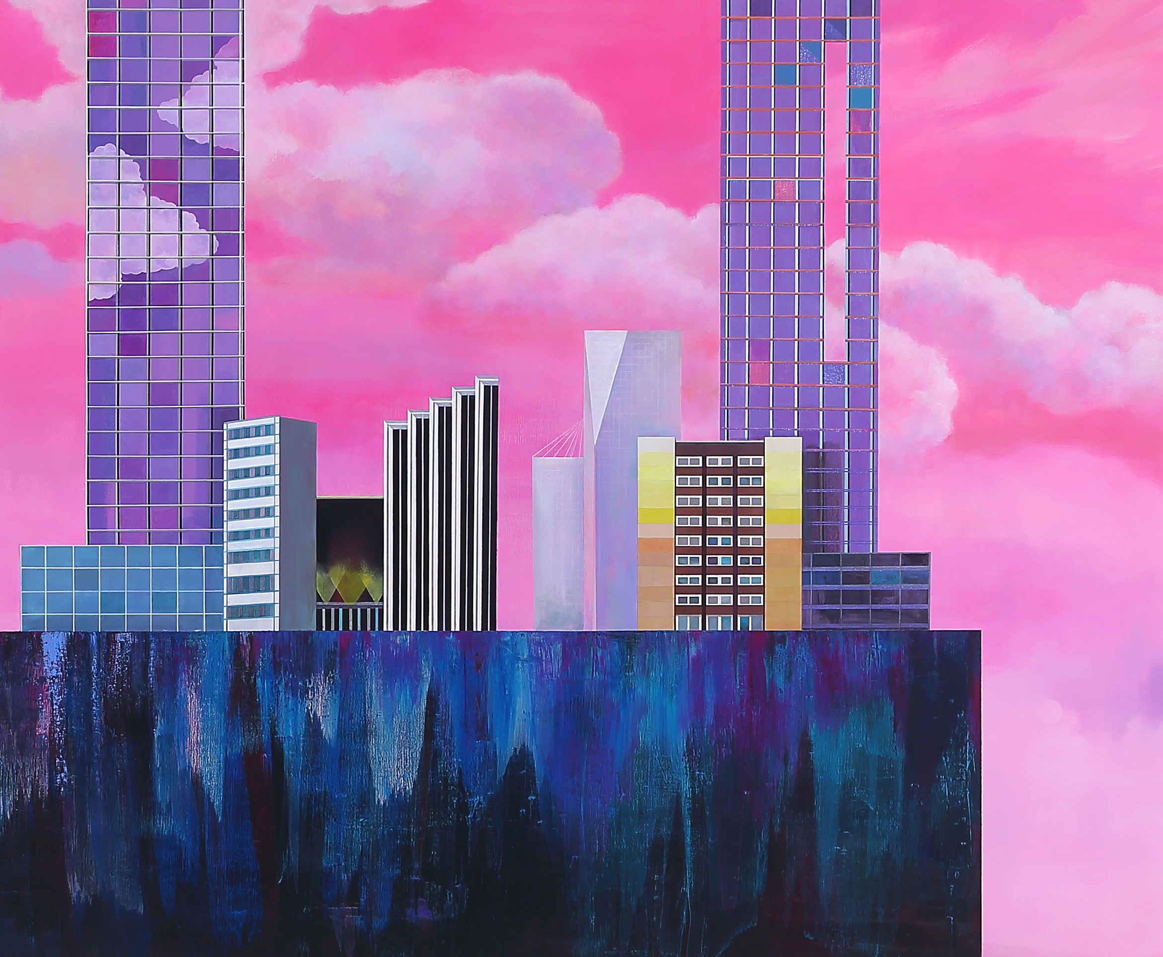 마그리트의 이미지가 인식의 문제를 제기했다면, 안소영의 화면은 감각과 기억의 문제로 그것을 전환한다. 특히 작가의 색채 감각은 이러한 주제적 확장과 물질적 수행성을 시각적으로 응집시키는 중요한 요소다. <동이 트기 전에> 시리즈에서 보여주는 군청의 깊고 맑은 푸른색, <내가 너에게 갈게> 연작을 관통하는 생명력 넘치는 초록의 향연, <안식처>와<Plastic city>에서 등장하는 초현실적인 네온 핑크의 하늘, 그리고 <응시> 시리즈 곳곳에서 발견되는 다양하고 선명한 색채들은 모두 현실의 중량감과 희망의 경쾌함 사이에서 작가가 찾아낸 미묘한 균형점을 보여준다. 이처럼 과감하면서도 정교하게 조율된 색채는 노동적으로 축적된 물질 위에 다시 한 번 ‘이미지의 가벼움’을 부여하는 이중적 전략의 완성이라 할 수 있다.