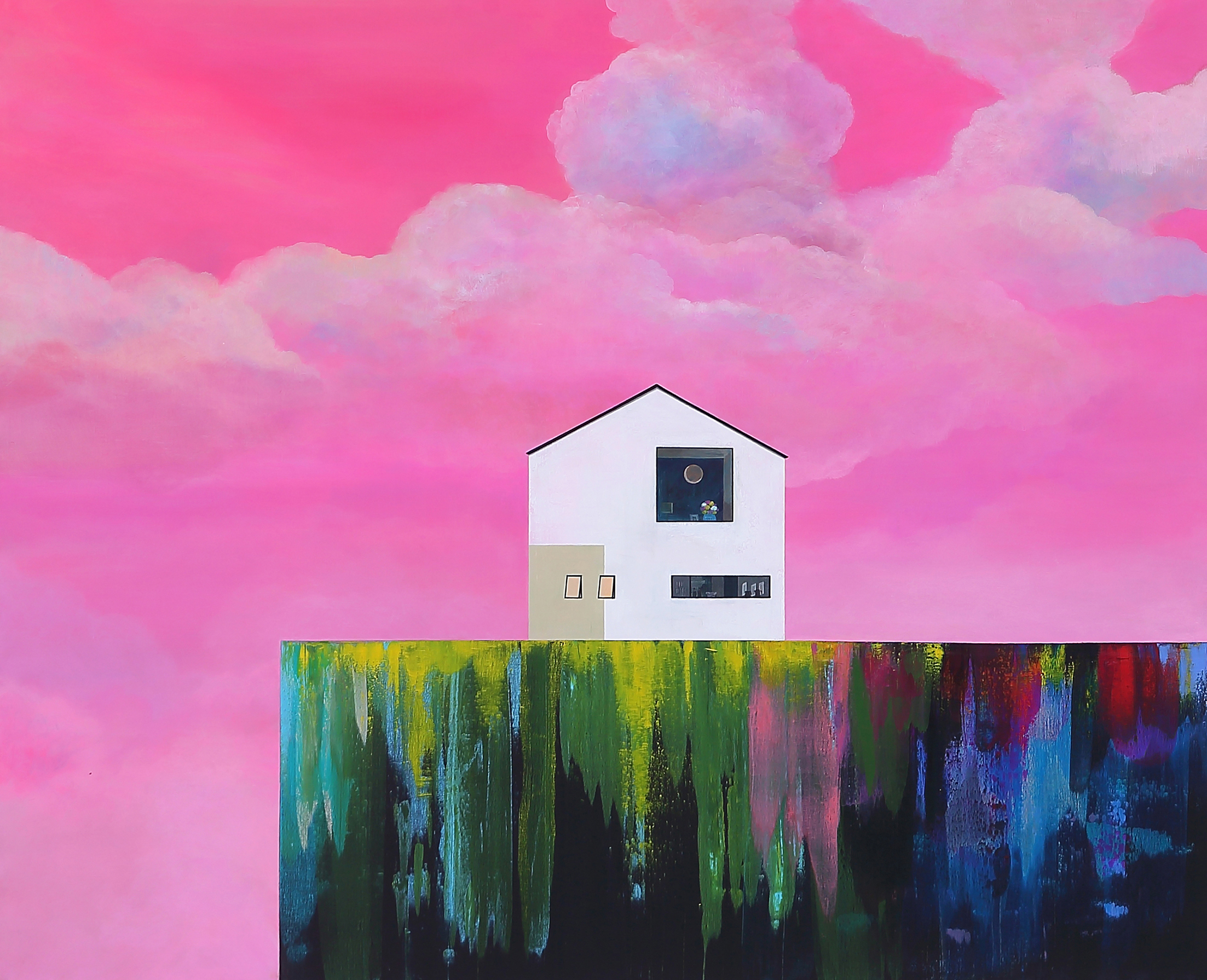 마그리트의 이미지가 인식의 문제를 제기했다면, 안소영의 화면은 감각과 기억의 문제로 그것을 전환한다. 특히 작가의 색채 감각은 이러한 주제적 확장과 물질적 수행성을 시각적으로 응집시키는 중요한 요소다. <동이 트기 전에> 시리즈에서 보여주는 군청의 깊고 맑은 푸른색, <내가 너에게 갈게> 연작을 관통하는 생명력 넘치는 초록의 향연, <안식처>와<Plastic city>에서 등장하는 초현실적인 네온 핑크의 하늘, 그리고 <응시> 시리즈 곳곳에서 발견되는 다양하고 선명한 색채들은 모두 현실의 중량감과 희망의 경쾌함 사이에서 작가가 찾아낸 미묘한 균형점을 보여준다. 이처럼 과감하면서도 정교하게 조율된 색채는 노동적으로 축적된 물질 위에 다시 한 번 ‘이미지의 가벼움’을 부여하는 이중적 전략의 완성이라 할 수 있다.