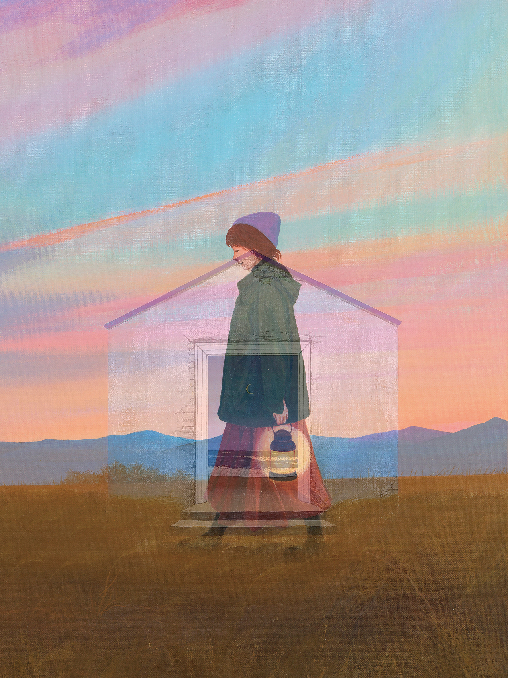 안소영의 작업을 관통하는 또 하나의 특징은 동일한 모티프가 여러 시리즈를 통해 끊임없이 재맥락화된다는 점이다. <집, 안식처>는 초기부터 이어져 온 가장 오래된 시리즈로, 2024년의 대작 <집, 안식처 10>과<Plastic city_Pink>의 병치는 현실적 공간과 이상적 공간, 혹은 도시와 자연의 긴장 관계를 보여준다. 이는 <동이 트기 전에> 시리즈가 대표하는 새벽의 고요와, <내가 너에게 갈게> 시리즈가 대표하는 그리움의 정서와 교차하며 풍부한 층위를 형성한다. 매체적 확장 또한 주목할 만하다. 2024년부터 본격화된 렌티큘러(Lenticular) 기법의 <되찾은 집> 시리즈는 집과 소녀, 혹은 두 개의 기억이 하나의 화면에서 겹쳐지며 ‘여행하는 자’와 ‘안식하는 장소’의 이분법을 해체한다. 이는 작가가 “물리적 공간인 집으로 갈 순 없지만, 마음에 평화가 생기니 더 이상 장소로서 안식처는 무의미해진다”고 고백한 지점을 시각적으로 증명하는 성과다. 하나의 화면 안에 복수의 이미지를 중첩시키는 이 방식은 고정된 회화의 시간을 해체하고, 지각의 시간성을 적극적으로 개입시킨다. 2026년 선보이는 <백지위임장에 관한 단상>(르네 마그리트(René Magritte, 1898-1967)의 <백지위임장> 오마주)은 이러한 확장의 정점에 위치한다. 마그리트 특유의 철학적 역설과 환상성을 차용하면서도, 안소영 특유의 동화적 색감과 소녀의 시선을 통해 ‘기억’과 ‘현실’, ‘이미지’와 ‘존재’의 경계를 다시 질문한다. 이는 작가가 ‘자기만의 여행’이라는 주제를 타자의 예술사적 텍스트와 대화시키며, 자신의 작업을 더욱 보편적인 층위로 확장시키는 시도다.