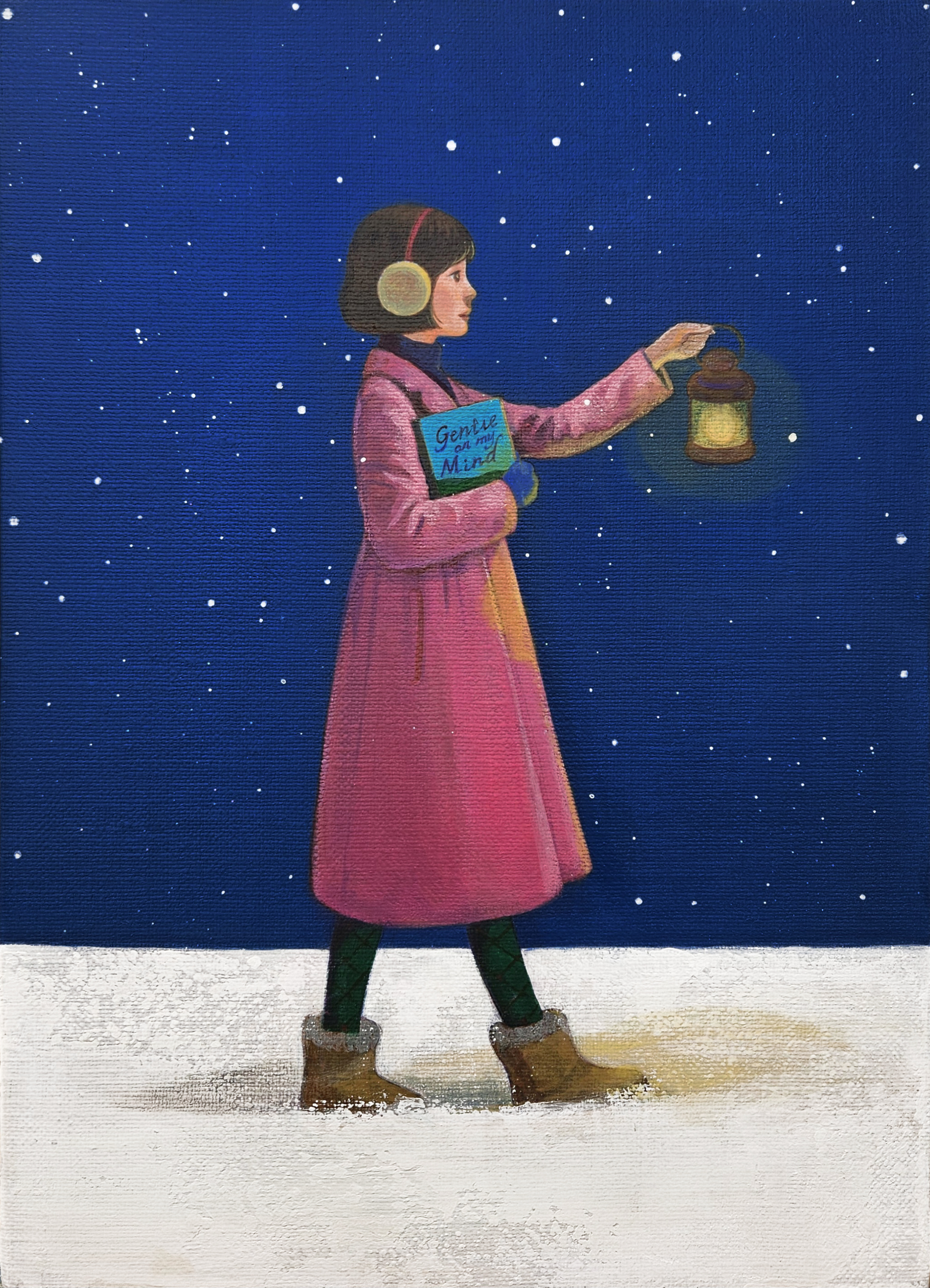 초기 작업이 그리움과 상실의 정서를 중심으로 전개되었다면, 최근 작업은 명확히 다른 방향을 향한다. 2026년 전시Gentle on My Mind는 그 전환을 상징적으로 보여준다. 이 제목이 암시하듯, 이제 기억은 더 이상 결핍의 대상이 아니라 내면에 이미 존재하는 안정된 상태로 변화한다. ‘마음에 잔잔히 머무는’ 풍경은 더 이상 상실의 대상으로서의 그리움이 아니라, 내면에 이미 자리한 안식처로서의 평화를 의미한다. 소녀의 표정에서, 자연과의 대화에서, 그리고 작가 자신의 “환한 웃음” 속에서 발견되는 것은 ‘인내한 삶’ 너머의 자발적이고 적극적인 치유의 에너지다. 여기서 주목할 변화가 있다. 초기 작업에서 작가가 ‘자기만의 여행자’로서 자신의 내면을 향한 선험적 탐색에 집중했다면, 최근에는 그 시선이 점차 주변과 타인을 향해 열리고 있다. 이는 존재를 가볍게 하고, 스스로를 세계의 일부로 내어놓는 일종의 ‘해체’의 과정이다. 그 결과 화면 속 자연은 더욱 풍성해지고, 색채는 더욱 밝아졌으며, 소녀는 자연 속의 한 요소로서 더욱 편안하게 자리하게 되었다. 스스로를 세계의 무게와 분리된 ‘여행자’가 아니라, 세계 속에 ‘속하는 존재’로 다시 상상하는 이 전환은 작가의 작업이 새로운 국면으로 접어들었음을 알리는 신호다. 이 변화는 ‘자기 발견’을 넘어 ‘자기 긍정’의 단계로 진입했음을 의미한다.