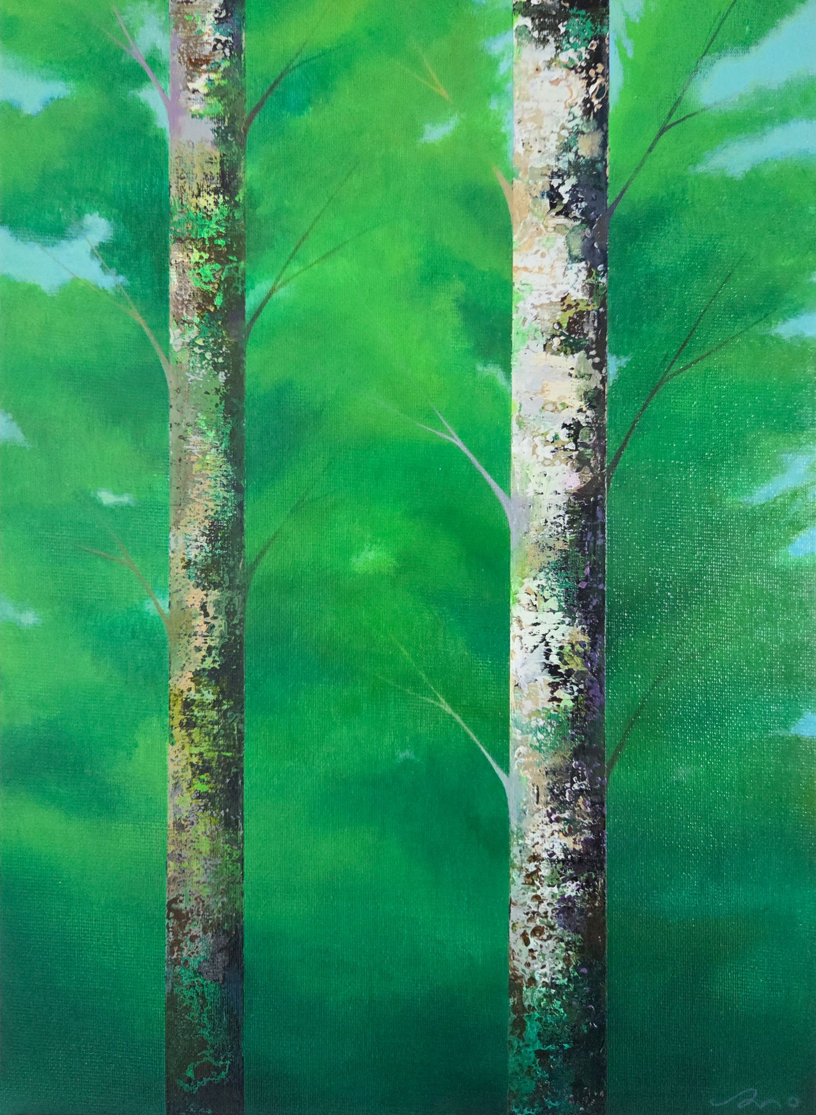안소영 작가의 작품세계에서 우선 떠오르는 것은 소녀와 자작나무 숲, 그리고 특유의 군청색으로 표현한 배경입니다. 주인공인 소녀를 감싼 이 군청색은 안정적이고 신비로운 느낌을 주며 내적 감정과 깊은 사유를 끌어냅니다. 아침과 저녁 노을의 핑크색, 맑은 하늘의 스카이블루가 직관적이라면 군청색은 단순한 시간의 표현을 넘어 내면의 감성을 아우른다는 점에서 관객들에게 시그니쳐 컬러로 어필해왔습니다. ■ 스페이스 엄의 초대전 <Gentle on My Mind> 에서는 초록색이 눈에 띕니다. “내가 너에게 갈게”라는 타이틀을 가진 초록색 배경의 작품들은 서로 만나지 못한 시간동안 쌓인 그리움의 정서를 초록의 숲과 들판을 거니는 소녀를 통해 풀어냅니다. 작가가 묘사한 그리움은 애틋하고 잔잔하지만 다시 만나기만을 기다리는 소극적인 감정이 아닌 “내가 너에게 갈게”라며 그리움에 맞서는 적극성을 보여줍니다. 실제로 만나러 가던, 혹은 다시 만나는 상상을 하던, 그리움에 대한 위로가 됨은 분명합니다.
