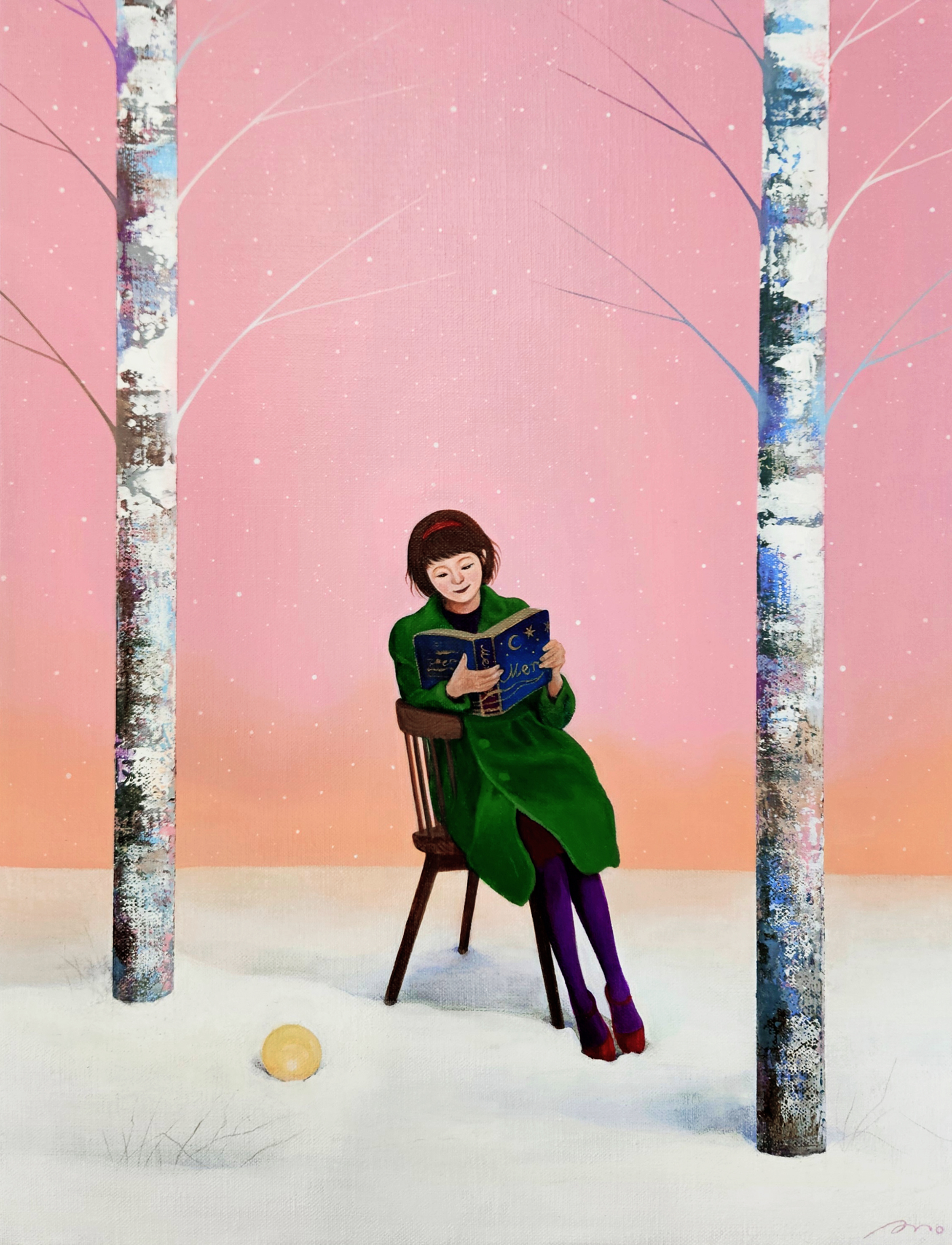 안소영 작가의 작품세계에서 우선 떠오르는 것은 소녀와 자작나무 숲, 그리고 특유의 군청색으로 표현한 배경입니다. 주인공인 소녀를 감싼 이 군청색은 안정적이고 신비로운 느낌을 주며 내적 감정과 깊은 사유를 끌어냅니다. 아침과 저녁 노을의 핑크색, 맑은 하늘의 스카이블루가 직관적이라면 군청색은 단순한 시간의 표현을 넘어 내면의 감성을 아우른다는 점에서 관객들에게 시그니쳐 컬러로 어필해왔습니다. ■ 스페이스 엄의 초대전 <Gentle on My Mind> 에서는 초록색이 눈에 띕니다. “내가 너에게 갈게”라는 타이틀을 가진 초록색 배경의 작품들은 서로 만나지 못한 시간동안 쌓인 그리움의 정서를 초록의 숲과 들판을 거니는 소녀를 통해 풀어냅니다. 작가가 묘사한 그리움은 애틋하고 잔잔하지만 다시 만나기만을 기다리는 소극적인 감정이 아닌 “내가 너에게 갈게”라며 그리움에 맞서는 적극성을 보여줍니다. 실제로 만나러 가던, 혹은 다시 만나는 상상을 하던, 그리움에 대한 위로가 됨은 분명합니다.