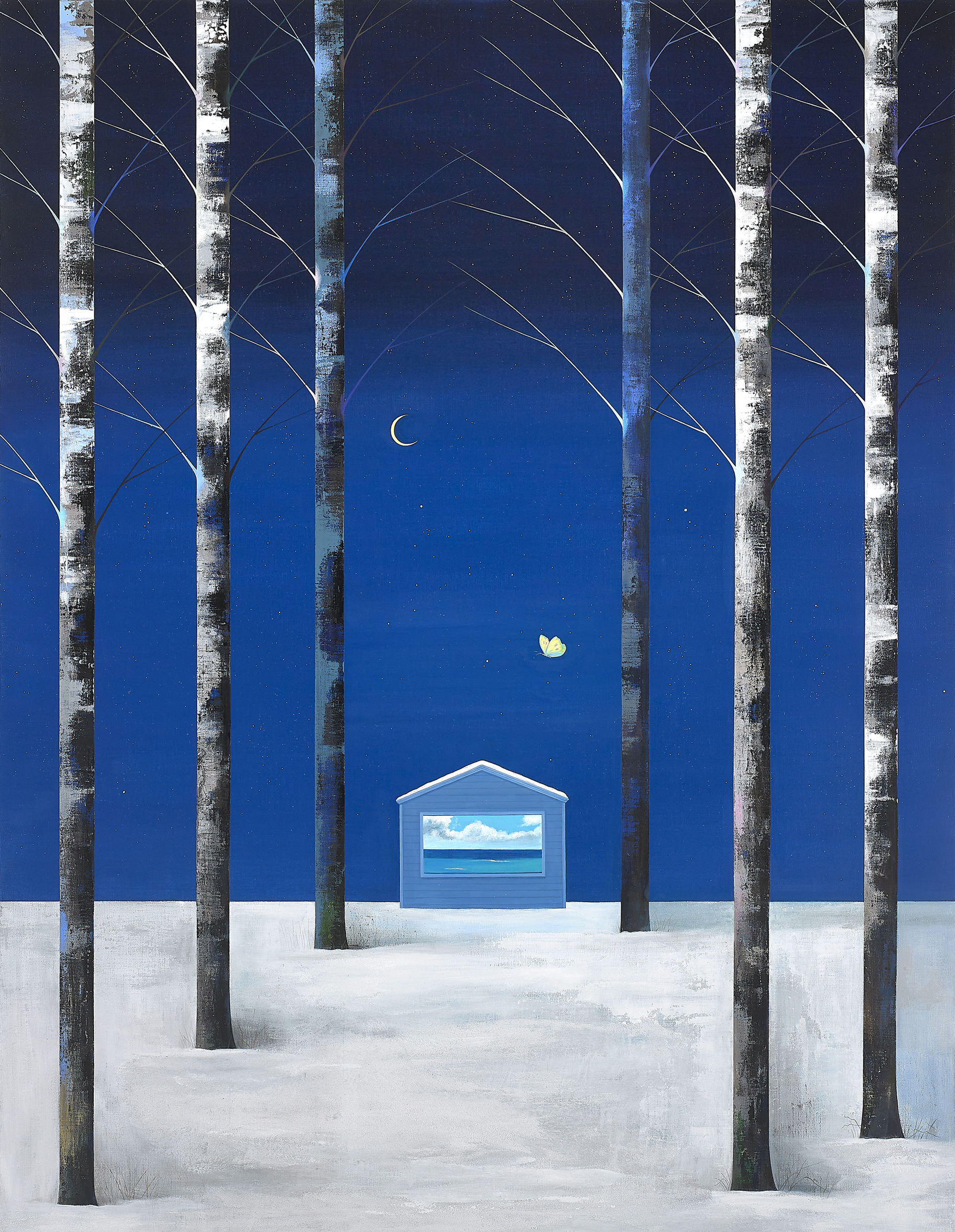 안소영의 작업을 관통하는 핵심 구조는 ‘집’과 ‘소녀’의 변증법이다. 초기 <집, 안식처> 시리즈에서 집은 불완전한 사각형 위에 놓인 불안정한 구조로 등장한다. 이는 물리적 공간이면서 동시에 심리적 균열을 드러내는 장치였다. 그러나 시간이 흐르며 집은 점차 내부로 이동한다. 2023년과 2024년 작품들에서 나타나는 집은 더 이상 외부에 놓인 대상이 아니라, 내면으로 통과하는 통로로 변한다. 문이 열려 있는 집, 내부에 바다가 펼쳐진 집은 ‘공간’이 아닌 ‘상태’를 의미한다. ‘소녀’는 작가의 또 다른 자아이자 보편적 존재로서의 ‘우리 자신’이다. 이 소녀는 경쟁과 자본 중심의 사회에서 ‘목적 없는 걷기’를 지속하며, 세상을 희망적인 시선으로 탐색한다. 이전 작품에서 소녀는 <자기만의 여행_노스탤지어>와 <시가된 풍경> 등을 통해 그리움과 상실의 정서를 담아내는 매개체였다면, 신작 <내가 너에게 갈게> 연작과 <응시> 연작에서는 더욱 적극적으로 타자와의 관계, 그리고 세계에 대한 집중적 시선을 획득한다.