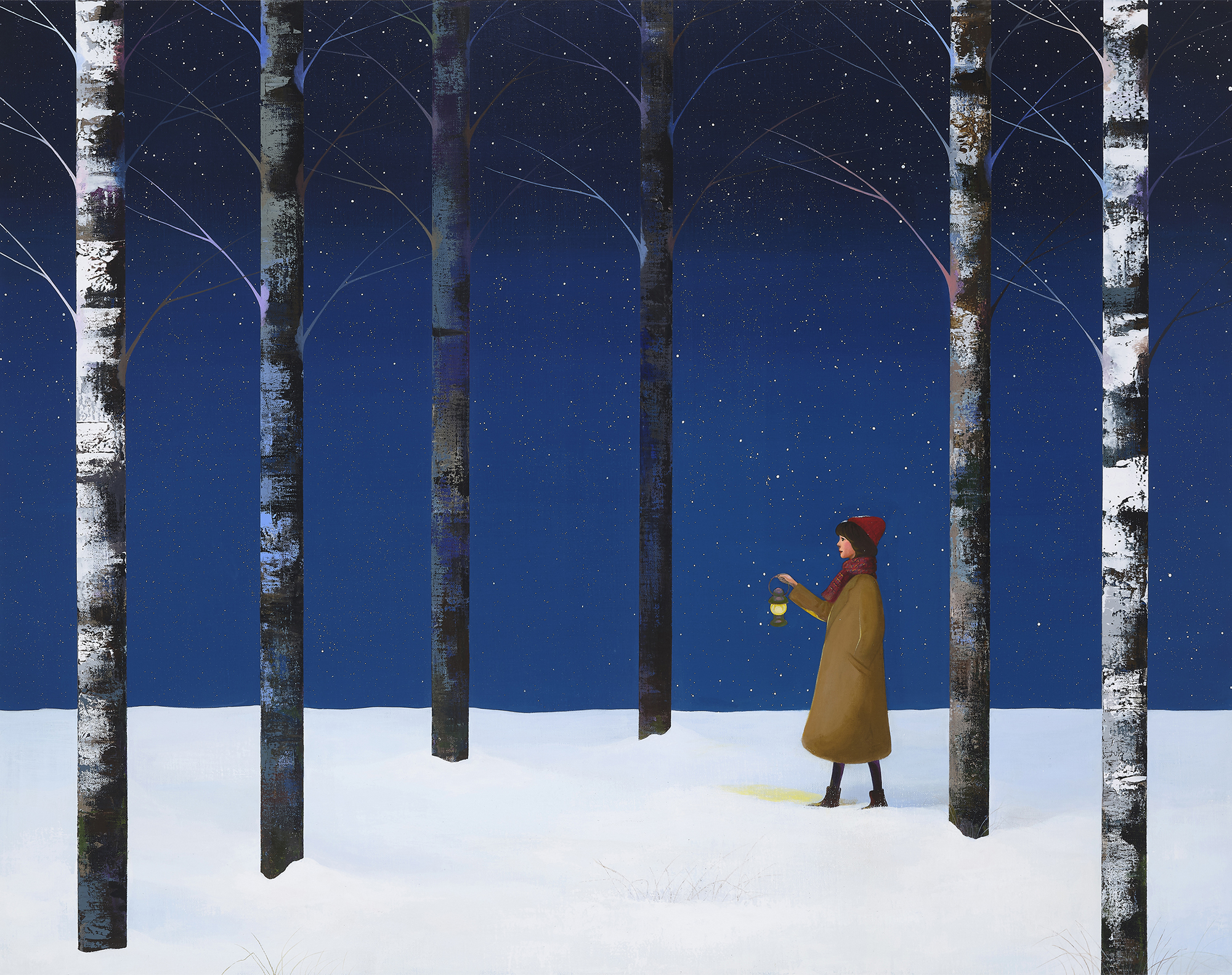 안소영 작가의 작품세계에서 우선 떠오르는 것은 소녀와 자작나무 숲, 그리고 특유의 군청색으로 표현한 배경입니다. 주인공인 소녀를 감싼 이 군청색은 안정적이고 신비로운 느낌을 주며 내적 감정과 깊은 사유를 끌어냅니다. 아침과 저녁 노을의 핑크색, 맑은 하늘의 스카이블루가 직관적이라면 군청색은 단순한 시간의 표현을 넘어 내면의 감성을 아우른다는 점에서 관객들에게 시그니쳐 컬러로 어필해왔습니다. ■ 스페이스 엄의 초대전 <Gentle on My Mind> 에서는 초록색이 눈에 띕니다. “내가 너에게 갈게”라는 타이틀을 가진 초록색 배경의 작품들은 서로 만나지 못한 시간동안 쌓인 그리움의 정서를 초록의 숲과 들판을 거니는 소녀를 통해 풀어냅니다. 작가가 묘사한 그리움은 애틋하고 잔잔하지만 다시 만나기만을 기다리는 소극적인 감정이 아닌 “내가 너에게 갈게”라며 그리움에 맞서는 적극성을 보여줍니다. 실제로 만나러 가던, 혹은 다시 만나는 상상을 하던, 그리움에 대한 위로가 됨은 분명합니다.