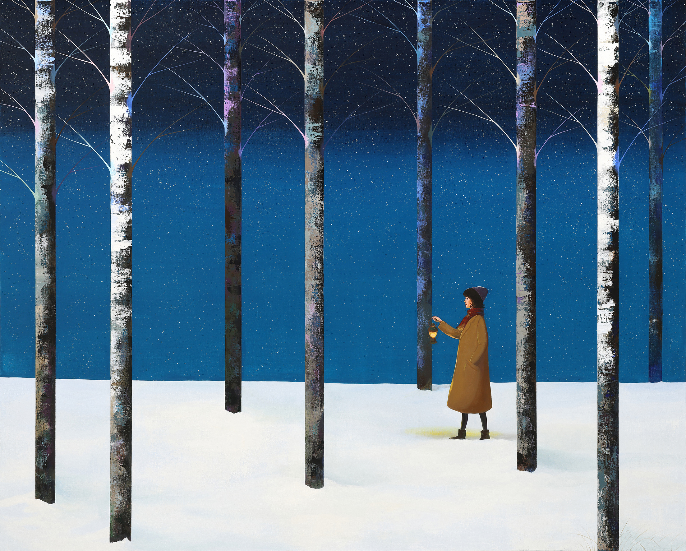 안소영 작가의 작품세계에서 우선 떠오르는 것은 소녀와 자작나무 숲, 그리고 특유의 군청색으로 표현한 배경입니다. 주인공인 소녀를 감싼 이 군청색은 안정적이고 신비로운 느낌을 주며 내적 감정과 깊은 사유를 끌어냅니다. 아침과 저녁 노을의 핑크색, 맑은 하늘의 스카이블루가 직관적이라면 군청색은 단순한 시간의 표현을 넘어 내면의 감성을 아우른다는 점에서 관객들에게 시그니쳐 컬러로 어필해왔습니다. ■ 스페이스 엄의 초대전 <Gentle on My Mind> 에서는 초록색이 눈에 띕니다. “내가 너에게 갈게”라는 타이틀을 가진 초록색 배경의 작품들은 서로 만나지 못한 시간동안 쌓인 그리움의 정서를 초록의 숲과 들판을 거니는 소녀를 통해 풀어냅니다. 작가가 묘사한 그리움은 애틋하고 잔잔하지만 다시 만나기만을 기다리는 소극적인 감정이 아닌 “내가 너에게 갈게”라며 그리움에 맞서는 적극성을 보여줍니다. 실제로 만나러 가던, 혹은 다시 만나는 상상을 하던, 그리움에 대한 위로가 됨은 분명합니다.